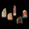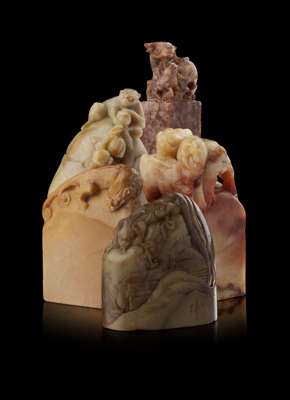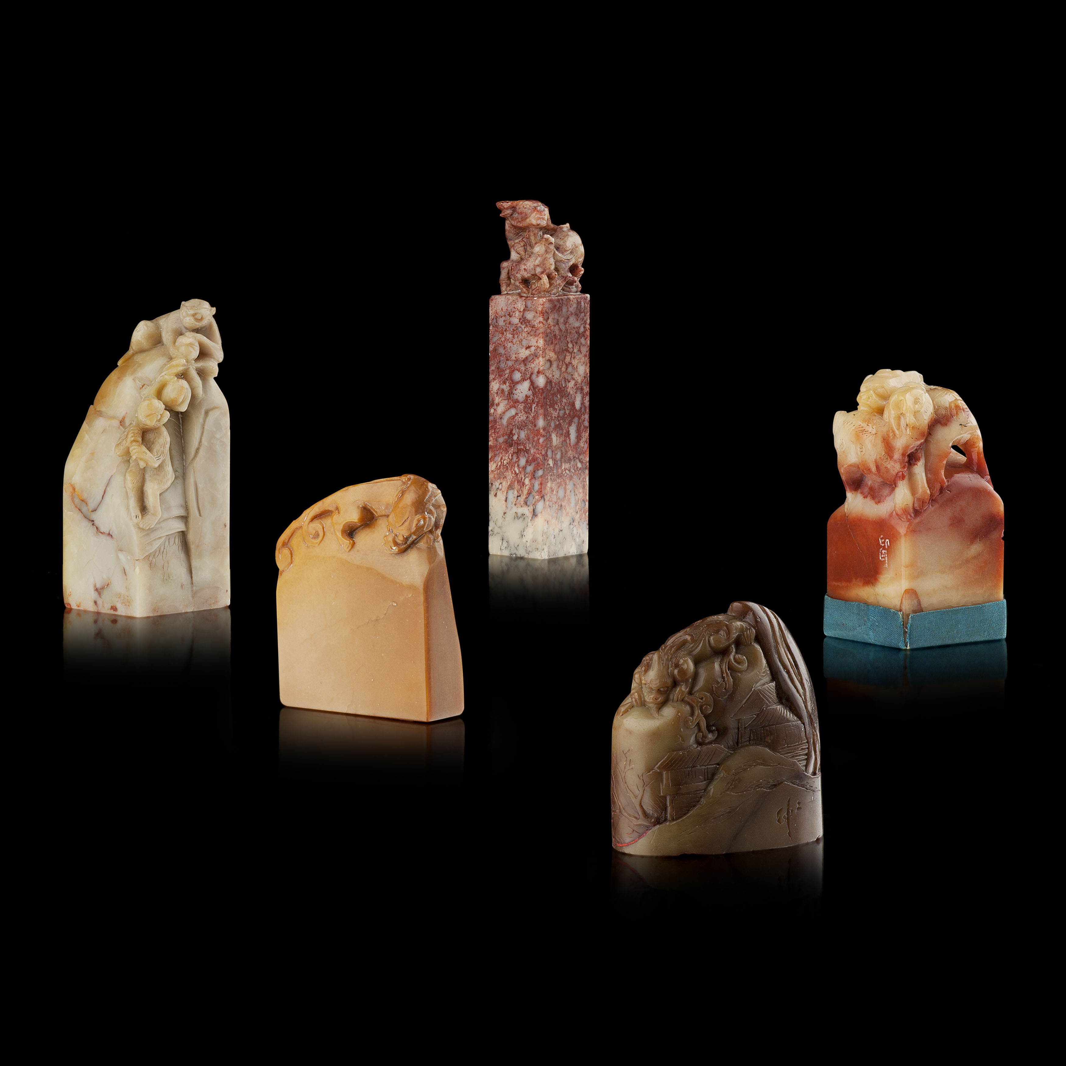 comprising a blank brown Shoushan seal carved with a tiger, 18th / 19th century, 4.4cm high; a Shoushan red lotus stone seal with two rams, 5.5cm high; a small mountain seal with a mythical beast, 3.8cm, high; a tall Shoushan seal with blank base with a buffalo and calf, 8.2cm high; and a blank Shoushan soapstone seal with a group of monkeys, 6.5cm high (5)