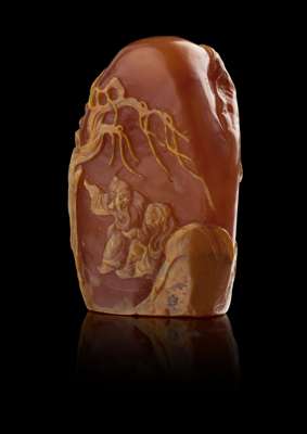 carved with scholars in a garden with rocks, banana leaves and a pavilion, the seal reading 'Heaven has conferred this "unicorn" [qilin] son'
