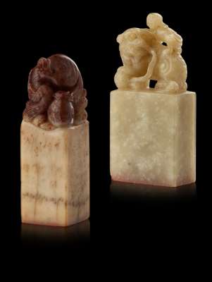 carved with a lion carrying a creature on its back, the seal reading 'I lead my life amidst books, just like a fish inside a sack', 8.2cm high; together with a CHINESE SHOUSHAN SOAPSTONE SEAL FOR XU NAILIN (1865-1940), depicting three carp, the seal reading 'Master Xu of the Resting Garden', 6.4cm high (2)