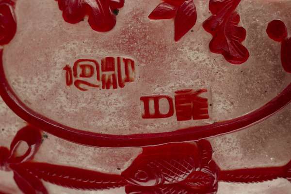 the handle in red cut to clear glass carved in high relief with fishermen, bridges, pagodas and blossoming foliage