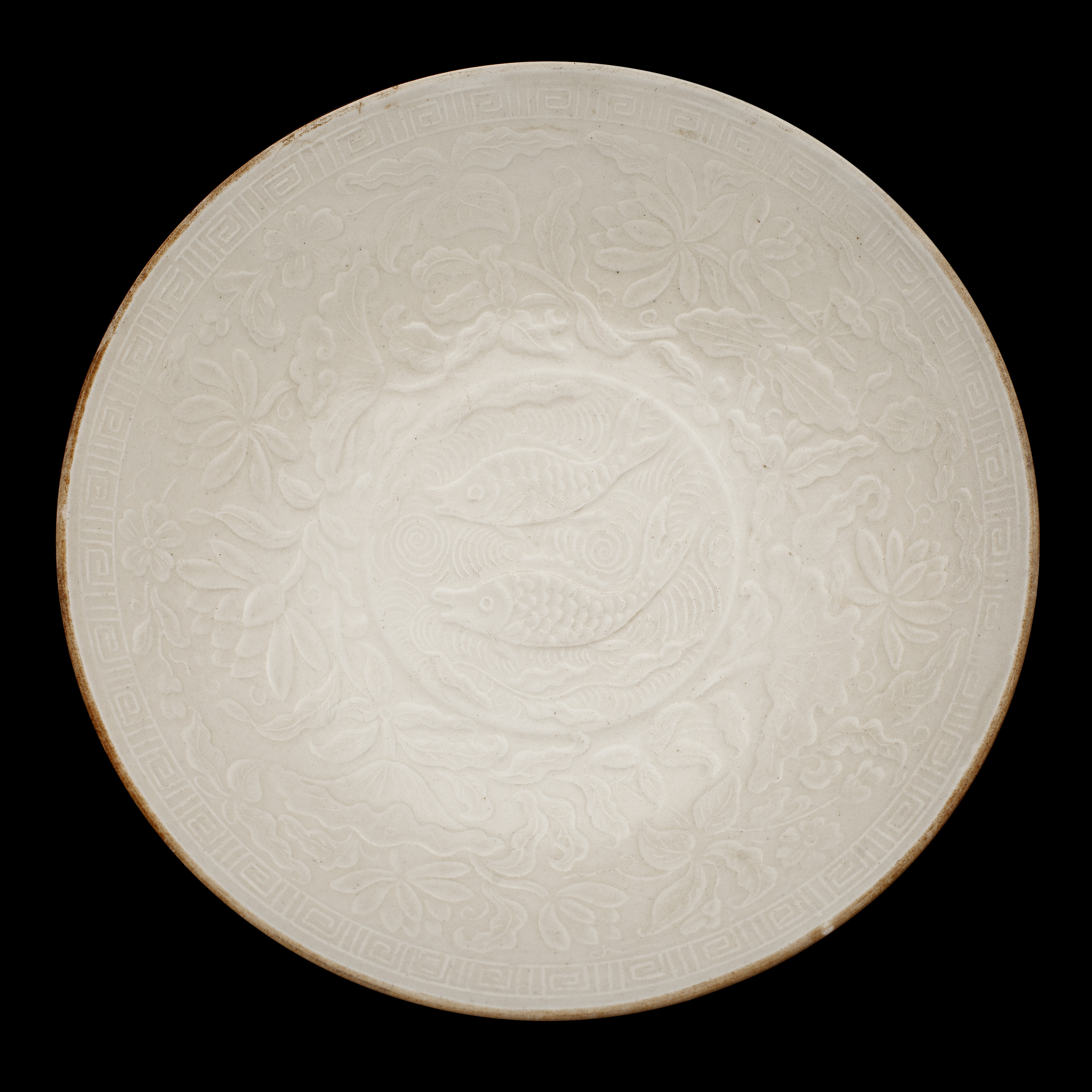 the centre with moulded decoration depicting a pair of swimming fish within a wide band of lotus and squared scroll border and unglazed rim, raised on a short straight foot