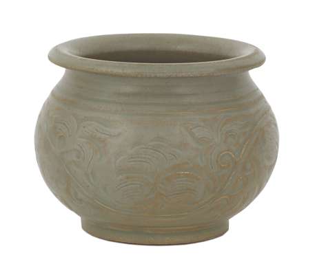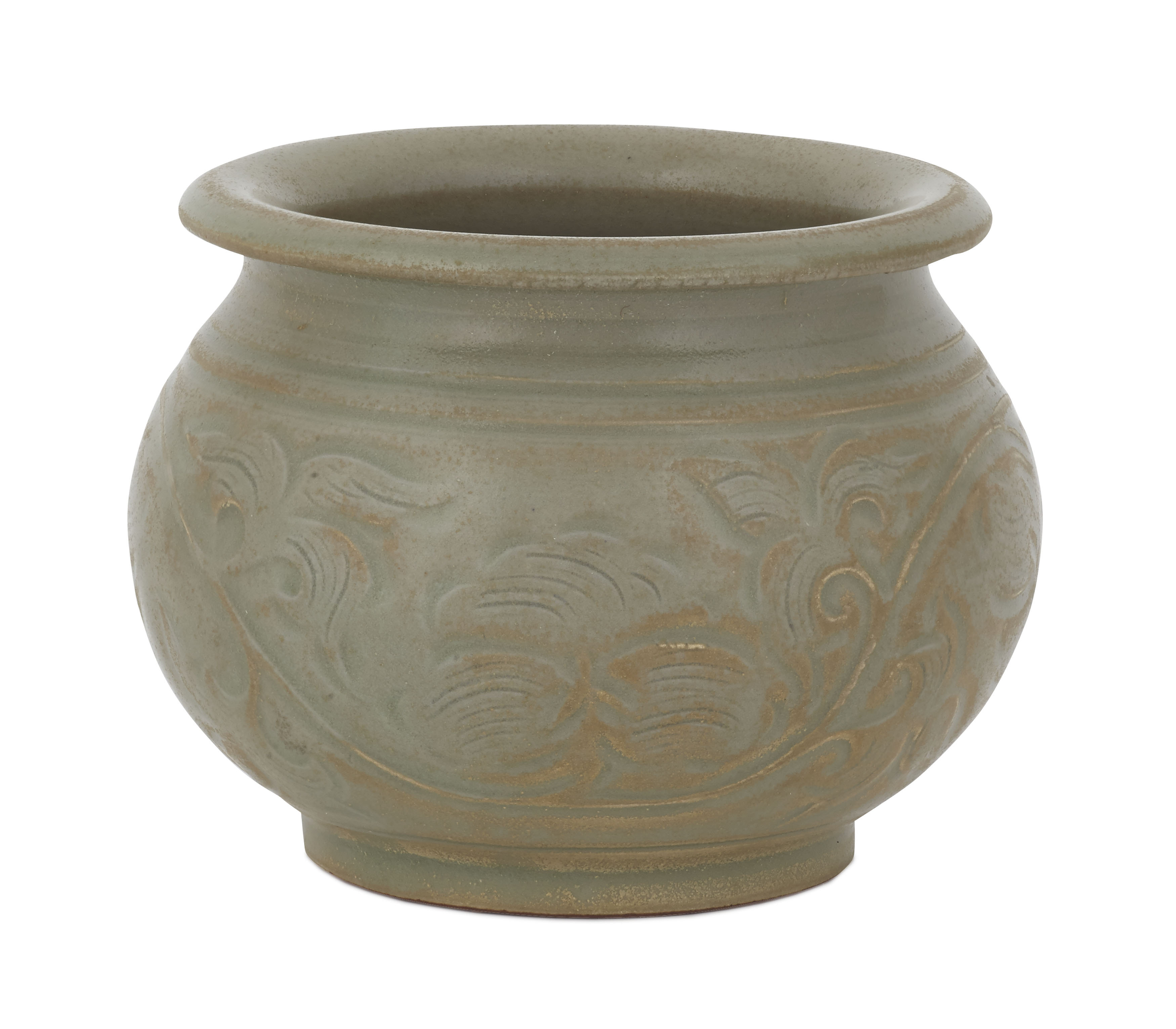 of short bulbous form with an everted rim, with carved decoration of a flowering vine