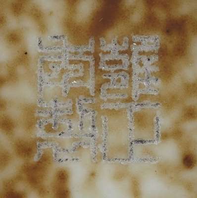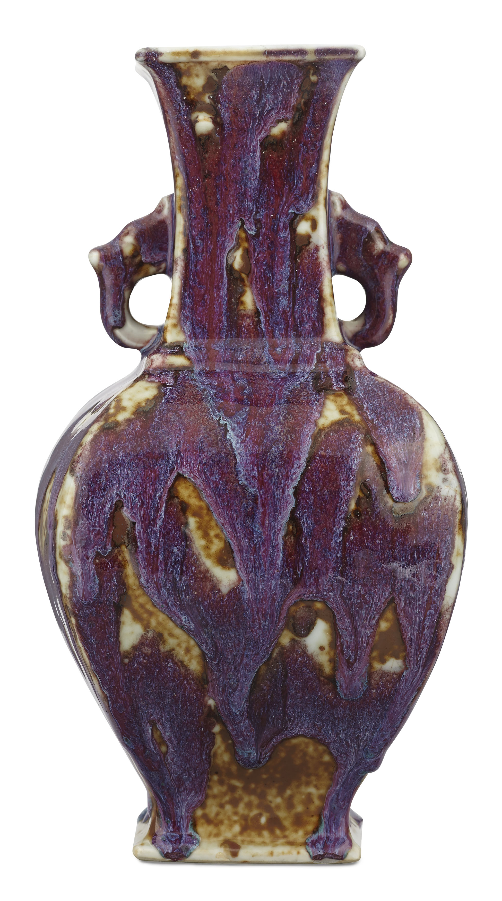 the square section vase with moulded mask loop handles, the thick purple flambe drip glaze over a mottled brown and white glaze ground, incised seal mark