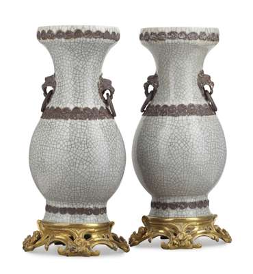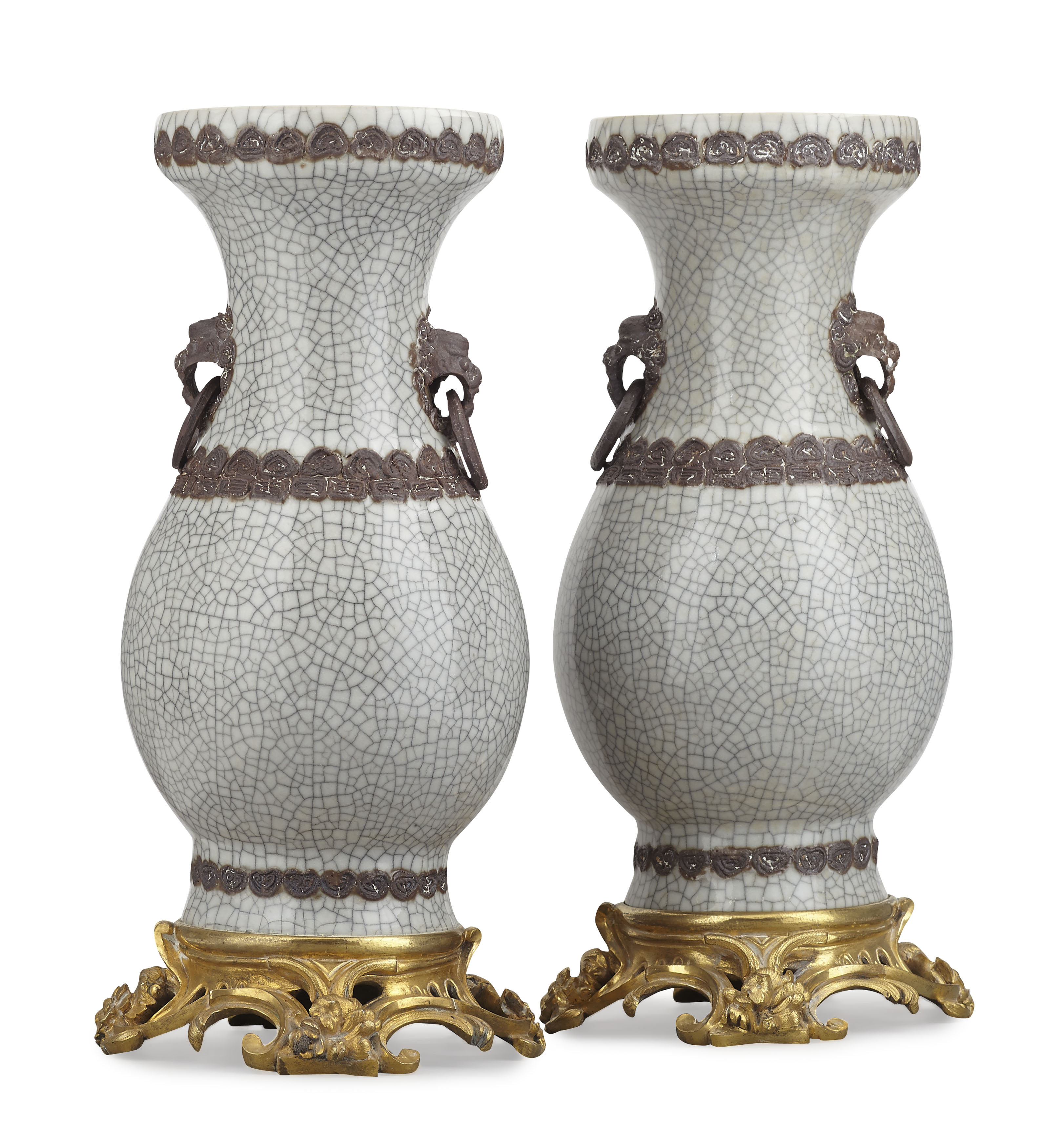 of baluster form with grey crackle glaze and moulded unglazed brown lion mask loop handles, the mouth, shoulder and foot with unglazed brown moulded bands, mounted on a gilt bronze rococo style base (2)