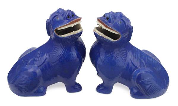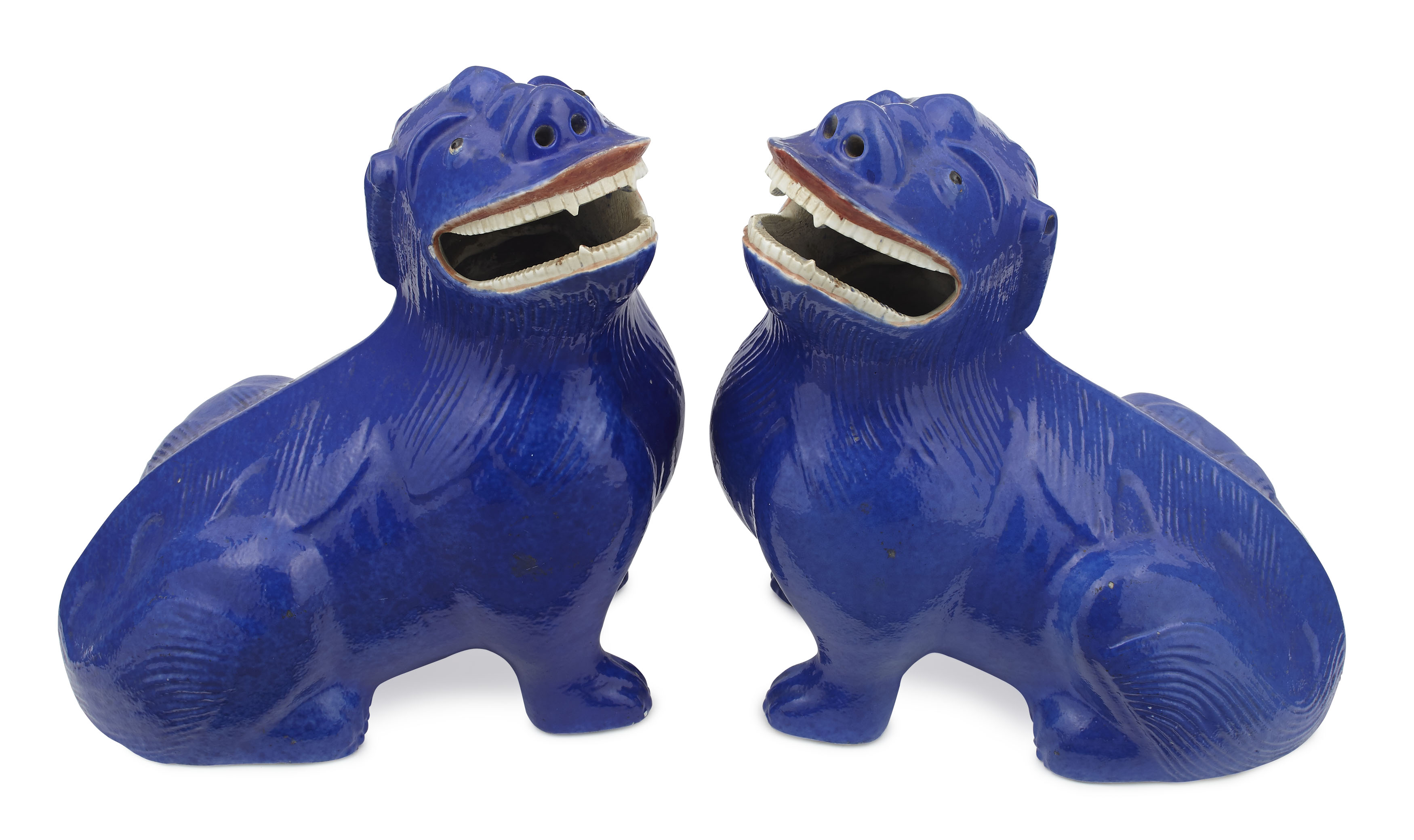 PAIR OF CHINESE EXPORT BLUE GLAZED FIGURES OF DOGS