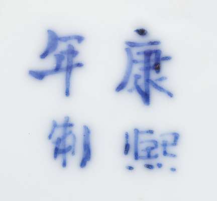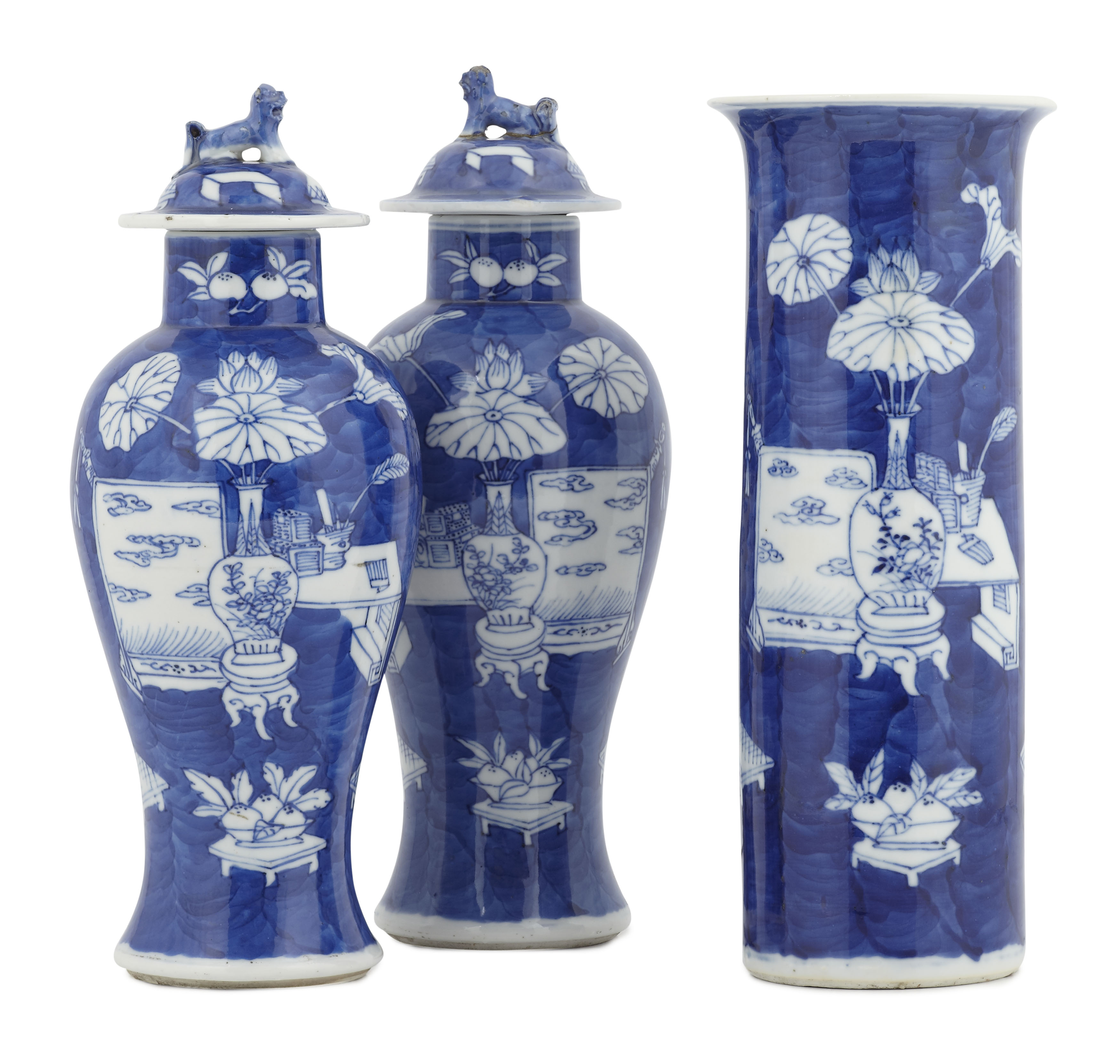 comprising a pair of covered baluster vases and a beaker vase, all decorated with lotus filled vases on stands, screens, and tables against a blue ground, underglaze blue four character Kangxi mark (3)