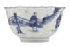 of moulded lotus form with a barbed rim, decorated with male and female figures in a landscape with rocks and a fence, underglaze blue six character Chenghua marks