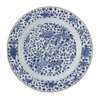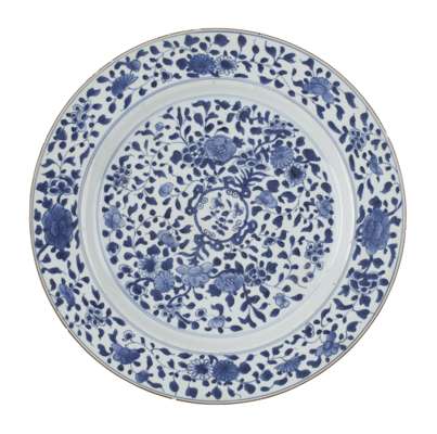 decorated with peony, lotus and chrysanthemum and cartouche against a scrolling foliate ground, with an ochre banded rim