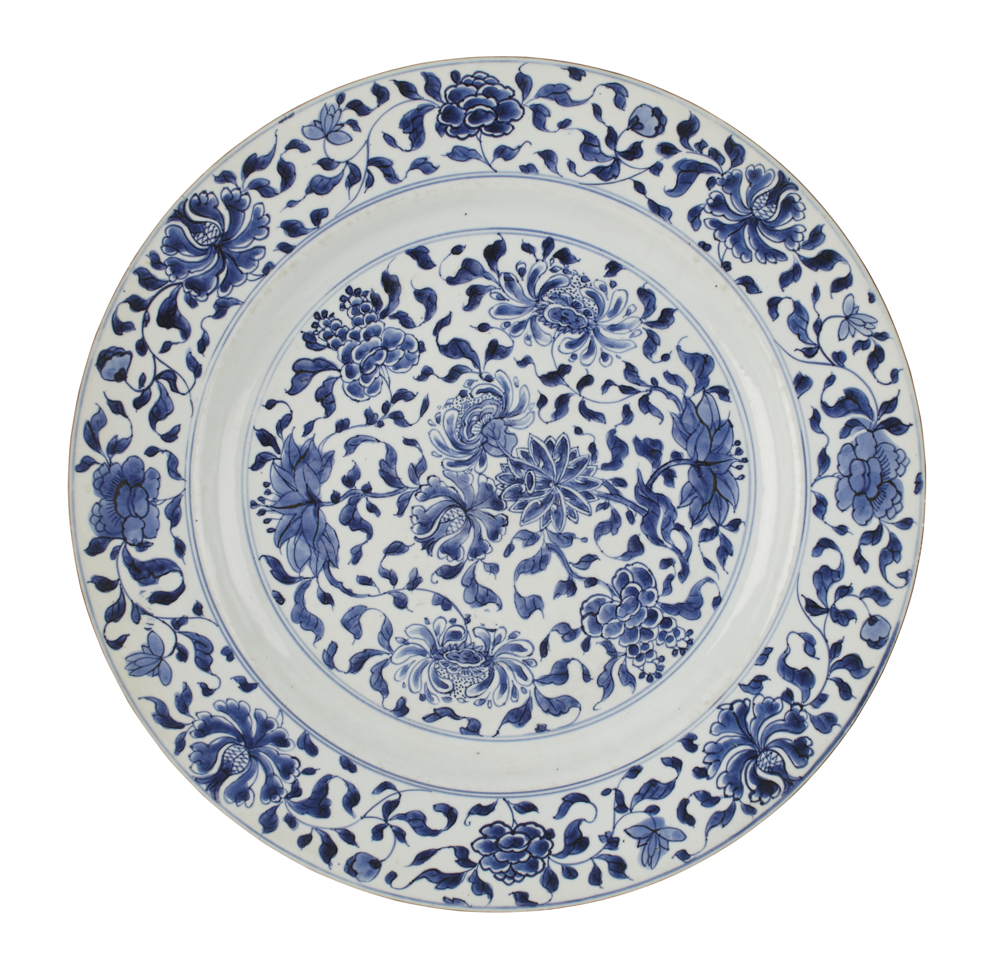 decorated with lotus, peony and other flowers against a scrolling foliate ground, with an ochre banded rim
