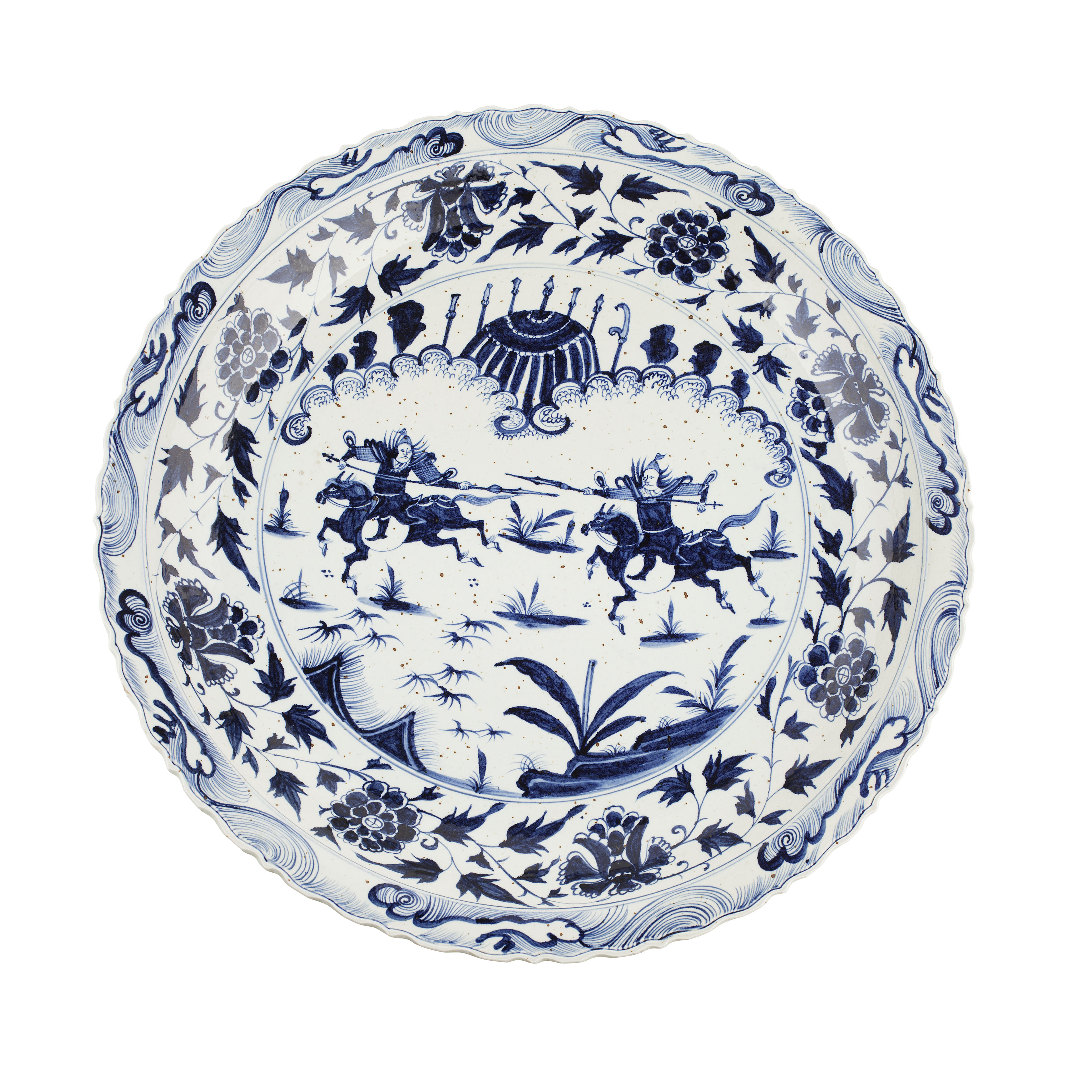 centrally decorated with two warriors on horseback within a border of foliate scrolls and lotus blossoms, the narrow barbed rim decorated with wave motifs, unmarked