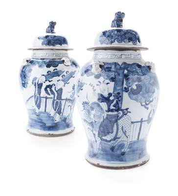 of baluster form, each with a domed cover with a fu lion finial, the jar sides decorated with a figure riding a kylin and two flag bearing attendants (2)