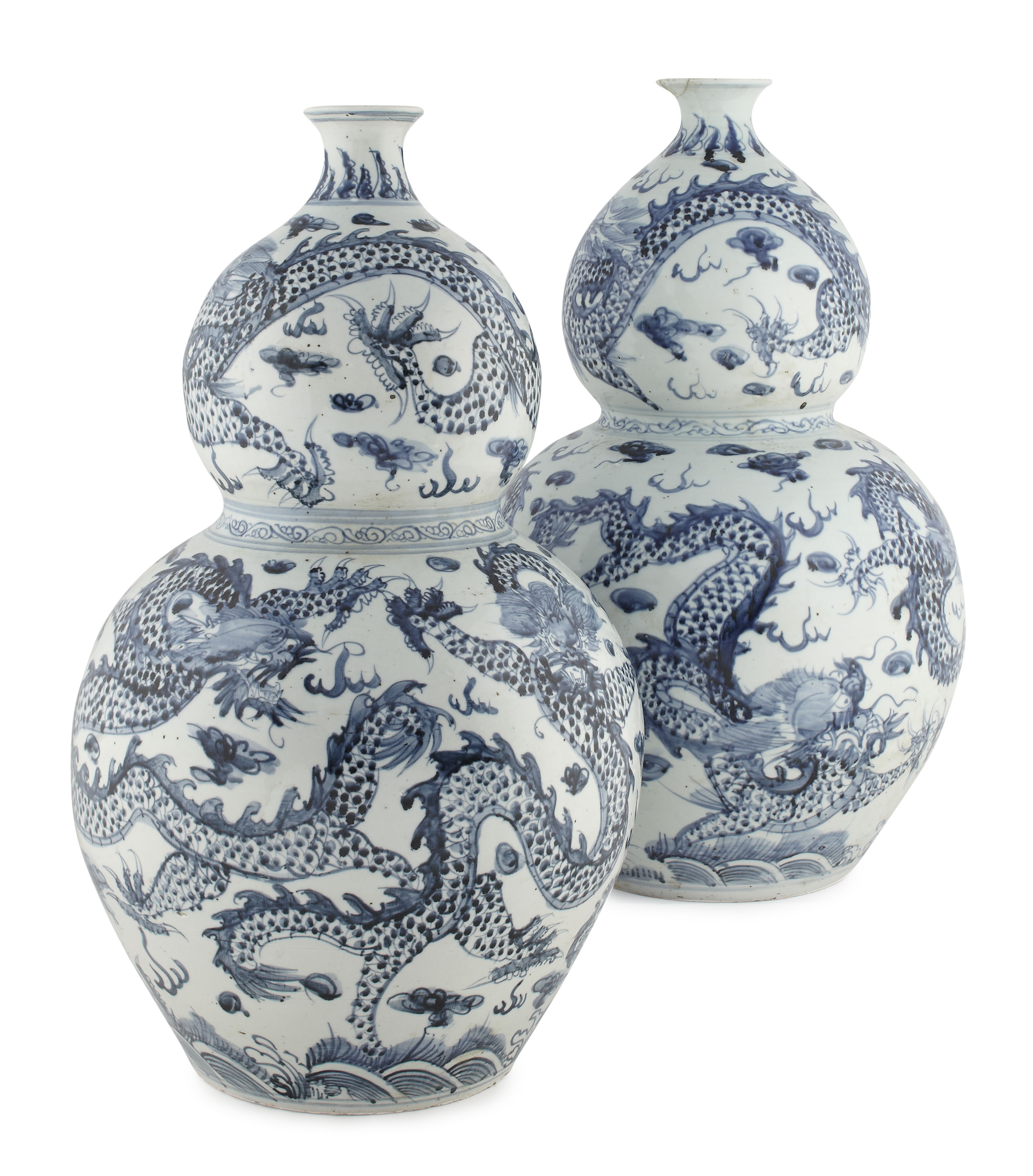 PAIR OF LARGE CHINESE BLUE AND WHITE DOUBLE GOURD 'DRAGON' VASES