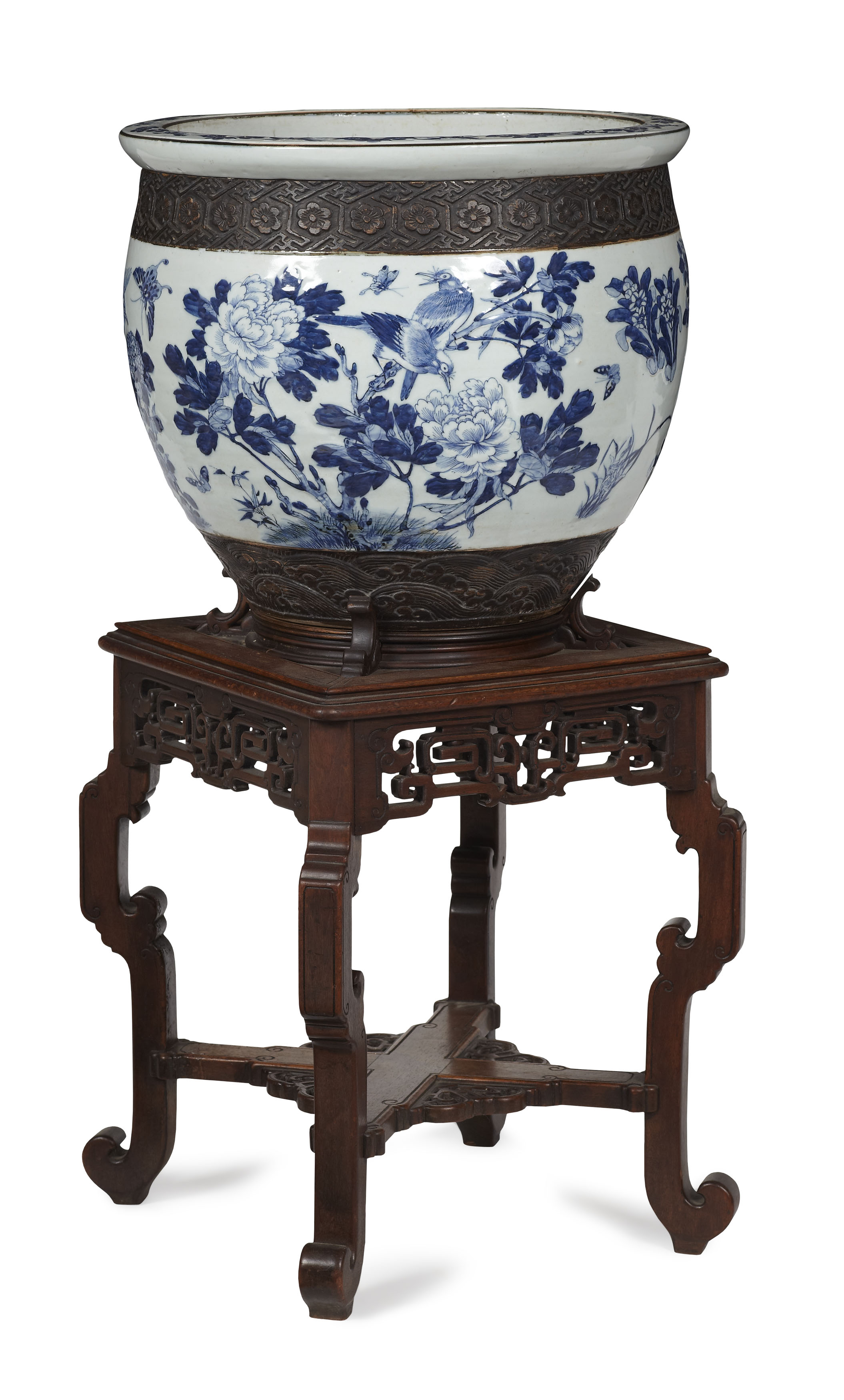 of deep U-shape with an everted rim, decorated with songbirds, butterflies, chrysanthemums, peonies, hydrangea, narcissus, with brown glazed relief moulded bands below the rim and to the foot; the integral stand with a square moulded top over a pierced and carved frieze, raised on square cabriole legs joined by an X-form stretcher