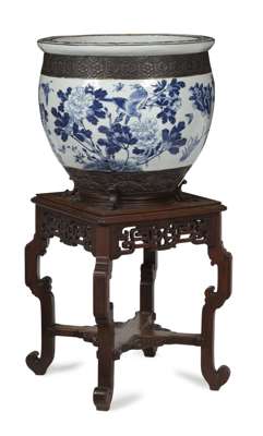 LARGE CHINESE BLUE AND WHITE JARDINIERE AND STAND
