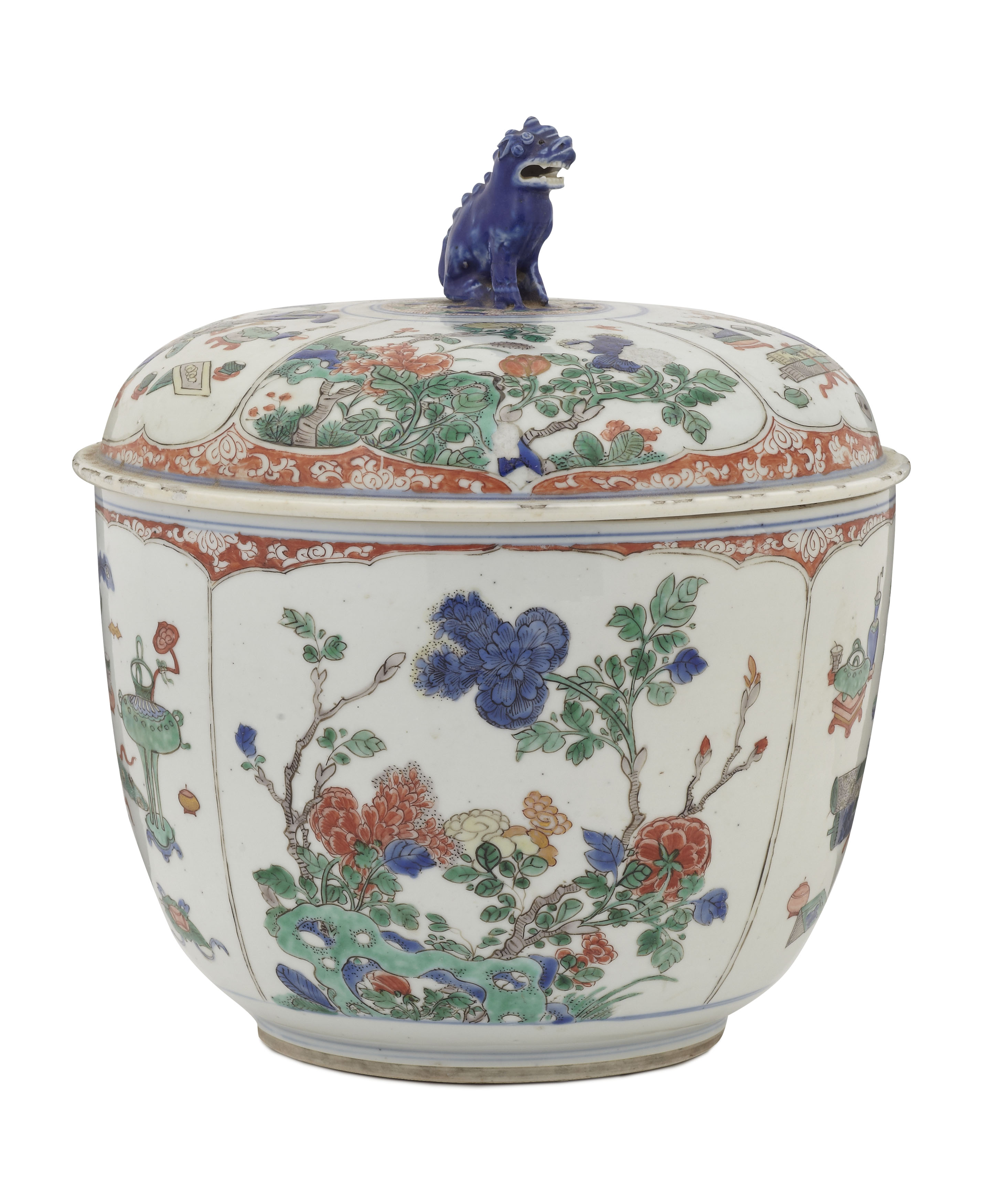 the domed cover and body with panels enamelled with flowering plants and precious objects, surmounted by a blue glazed fu lion finial