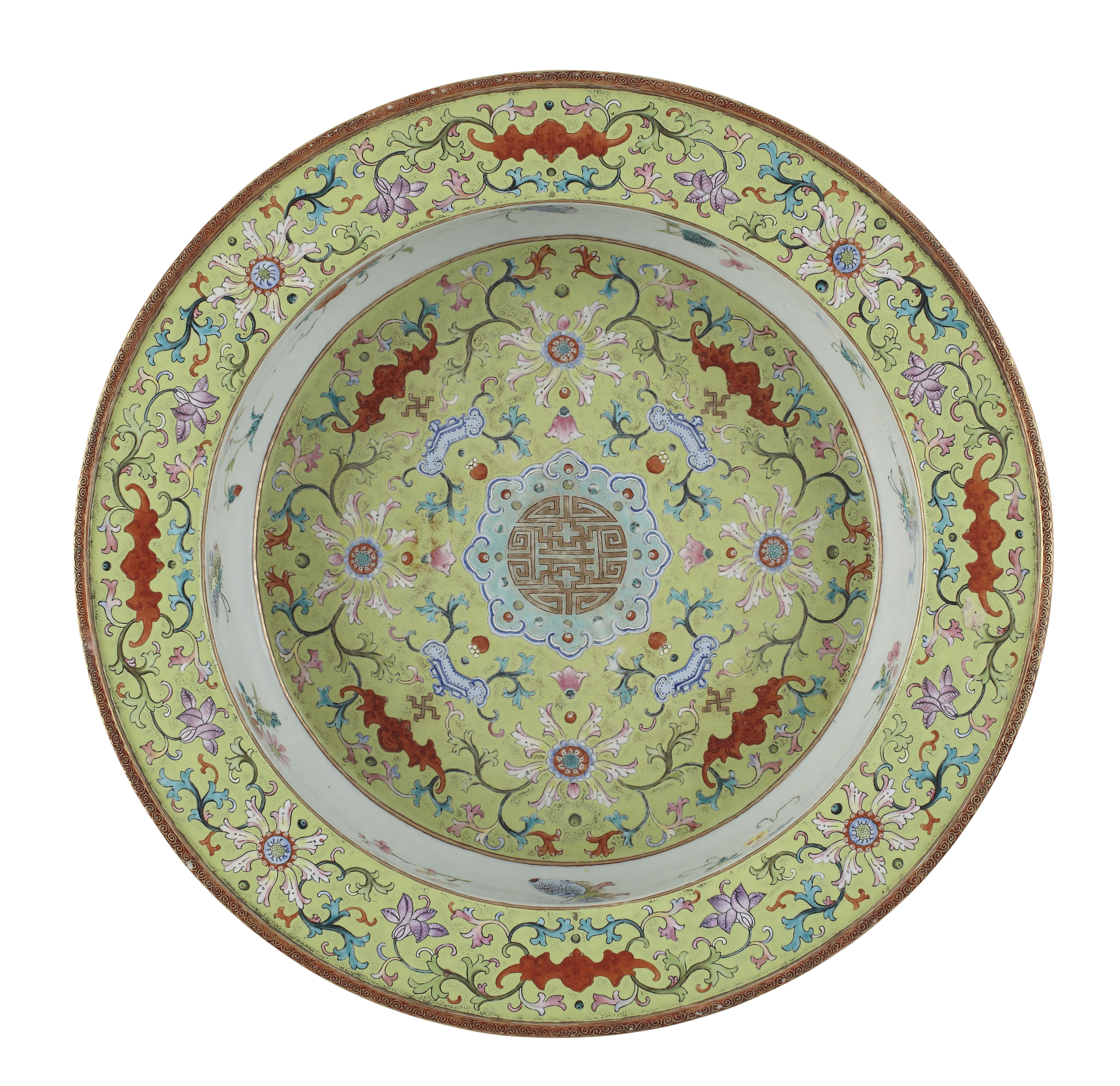 having a flat bottom with a wide flattened rim, decorated in enamels with bats, lotus blossoms, butterflies, gourds and ruyi sceptres against a chartreuse green ground, within iron red and gilt bands, unmarked
