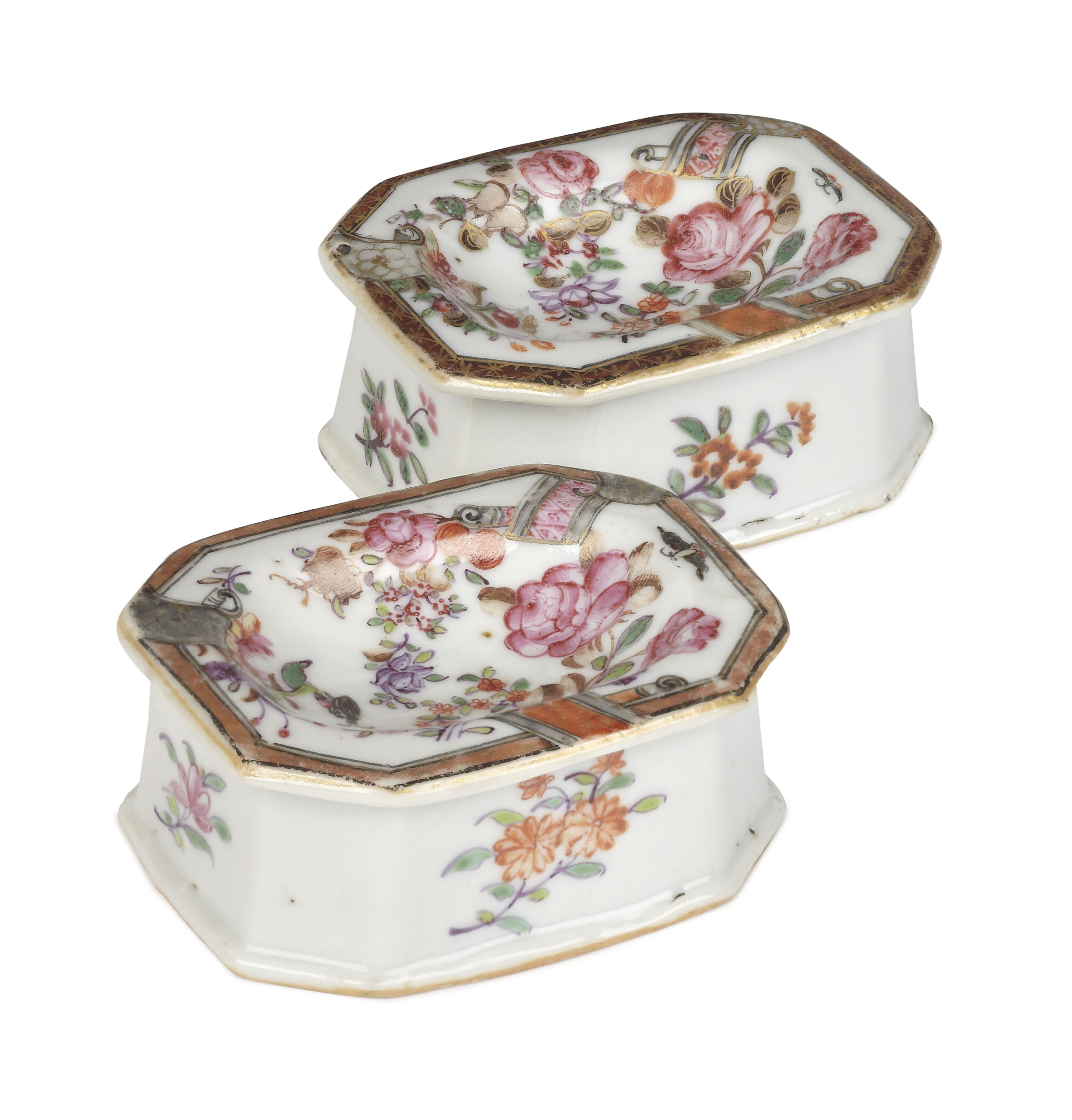 of canted rectangular form, each painted with blossoming branches within a scroll border (2)