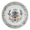 centrally decorated in polychrome enamels with a cartouche shaped coat-of-arms surmounted by a coronet, the border with bull masks and ribbon tied floral swags