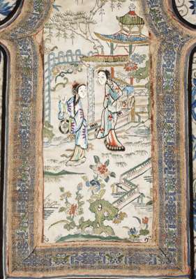 the pleated peach coloured silk edged in black with a central panel embroidered with a scene of ladies in a garden