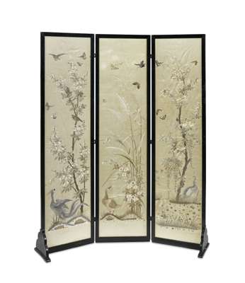 CHINESE SILK EMBROIDERED THREE PANEL SCREEN