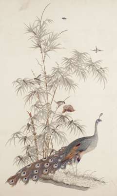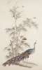 finely embroidered with a peacock, songbirds and insects in bamboo, on a cream silk ground, mounted on card, unframed