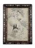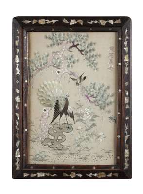 depicting a peacock standing on a rock beneath a pine tree with a songbird on a branch, four character inscription, in a mother of pearl inlaid hardwood frame; together with a CHINESE NEEDLEWORK PANEL worked in blue silk on gold depicting two butterflies and flowers, framed (2)
