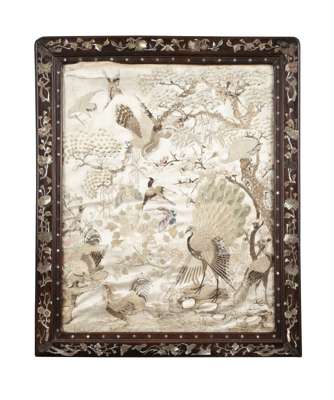 the rectangular panel embroidered with an assembly of birds and insects, in a hardwood frame inlaid with mother of pearl fruit and flower garlands
