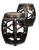 of barrel form, each with a circular marble inset top over open sides with quatreform stretchers, all inlaid with mother of pearl flowering vines, raised on short shaped legs (2)