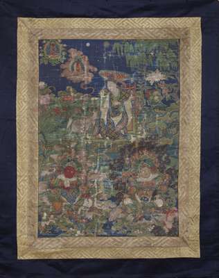 painted with a seated Tara amongst wild animals, Bodhisattva and deity, framed