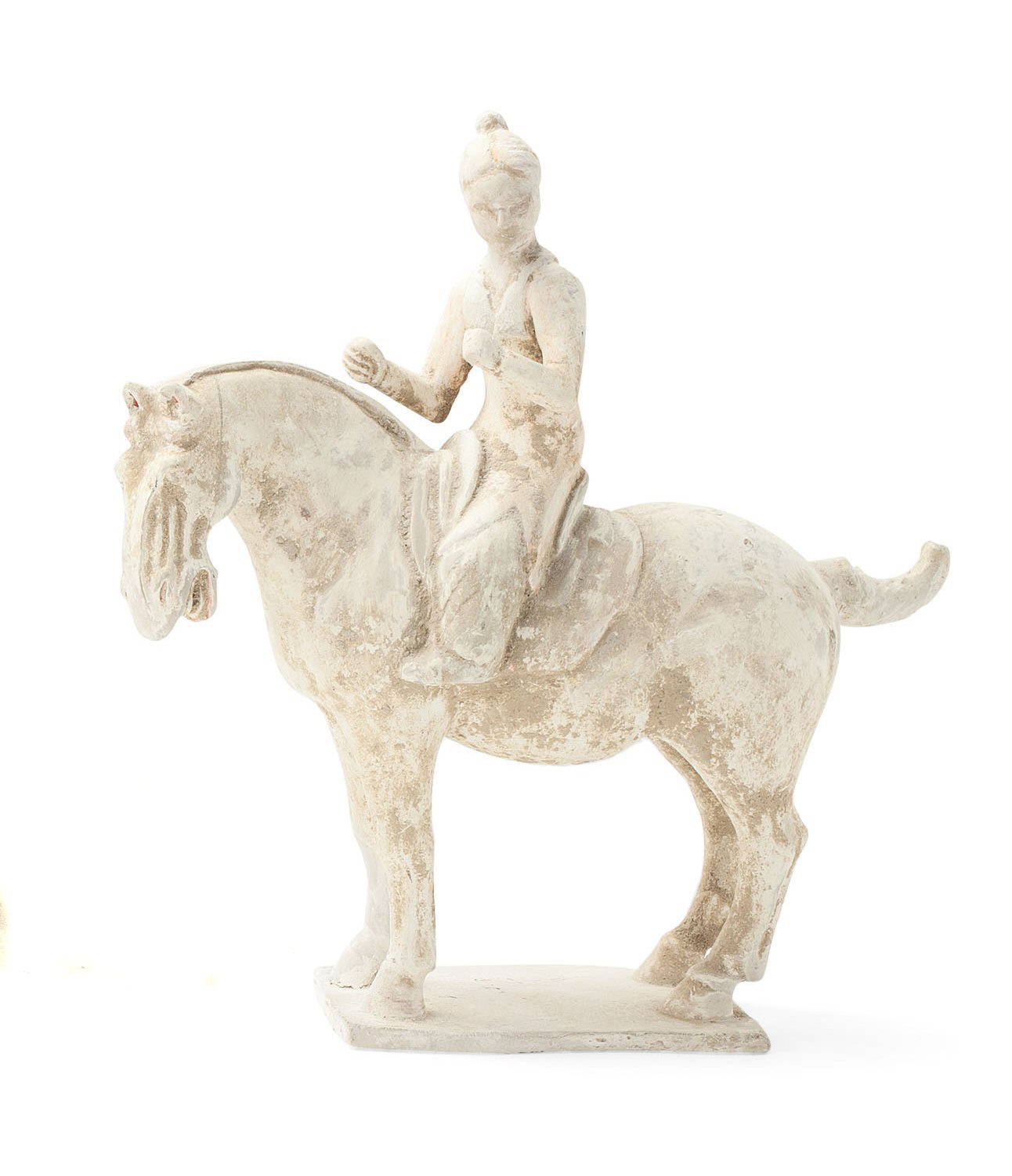the female rider sitting firmly in the saddle and turned to her left, the horse standing four square on a rectangular base