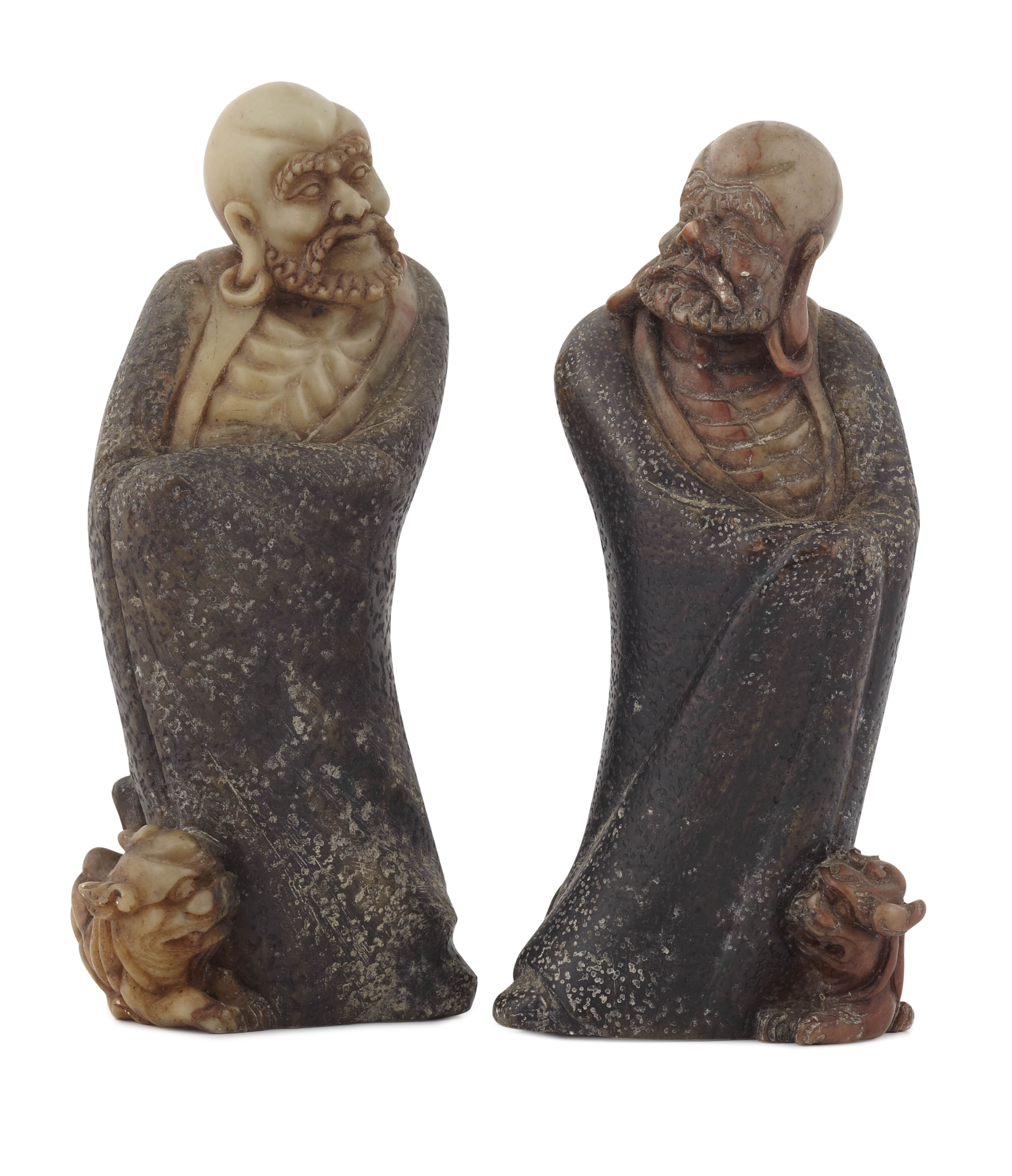 PAIR OF CHINESE CARVED SOAPSTONE FIGURES OF LOHANS
