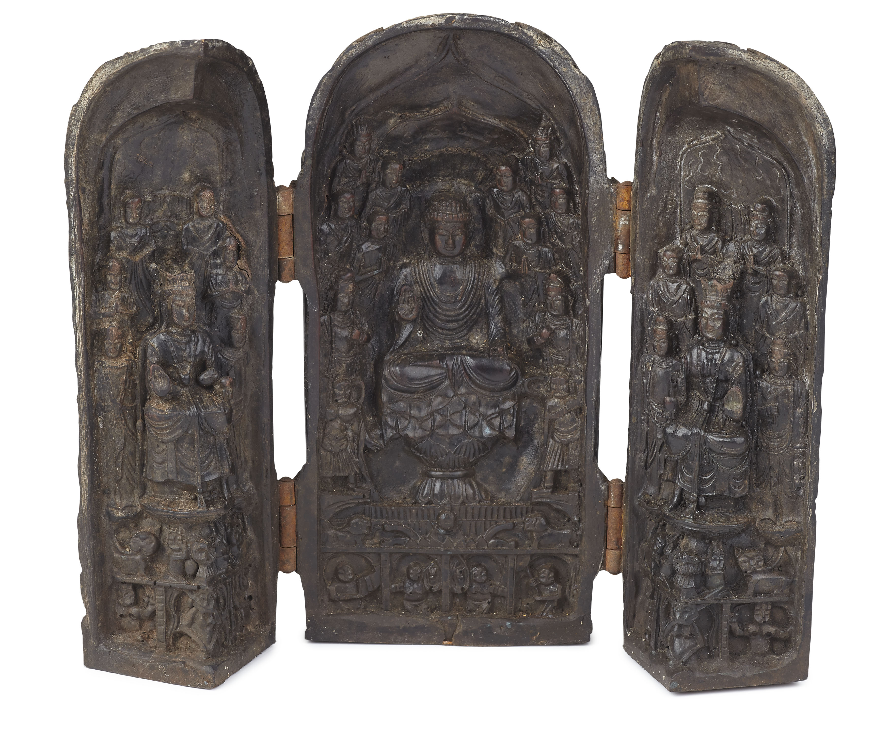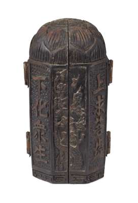 the octagonal box with carved text panels alternating with floral reliefs, the domed top carved as a lotus, the hinged sides opening to reveal an interior carved in high relief with a central figure of Buddha and attendants