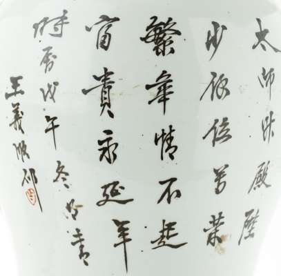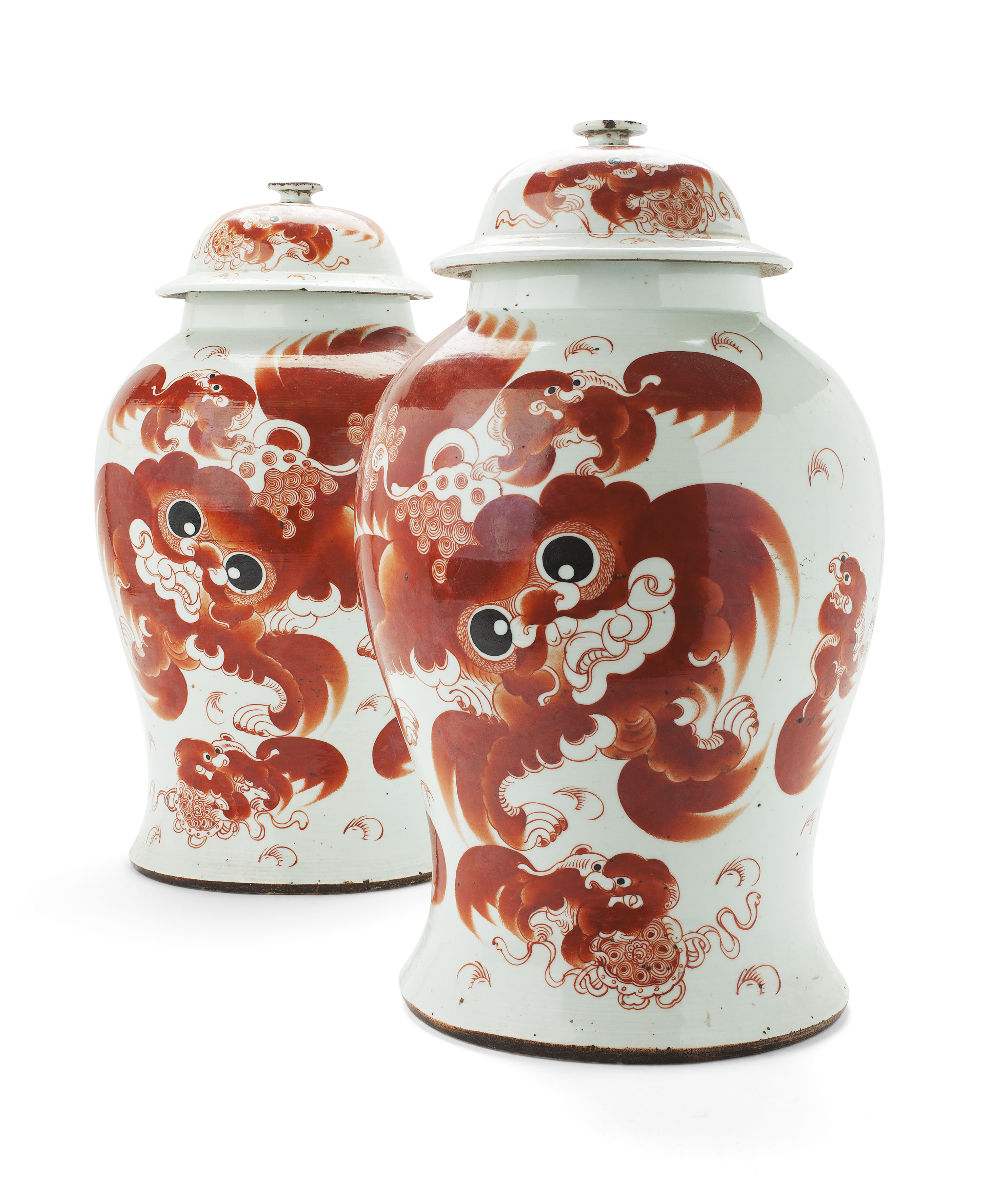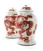 of baluster form with a domed cover with flat knop, decorated in iron red with fu dogs and a calligraphy inscription (2)