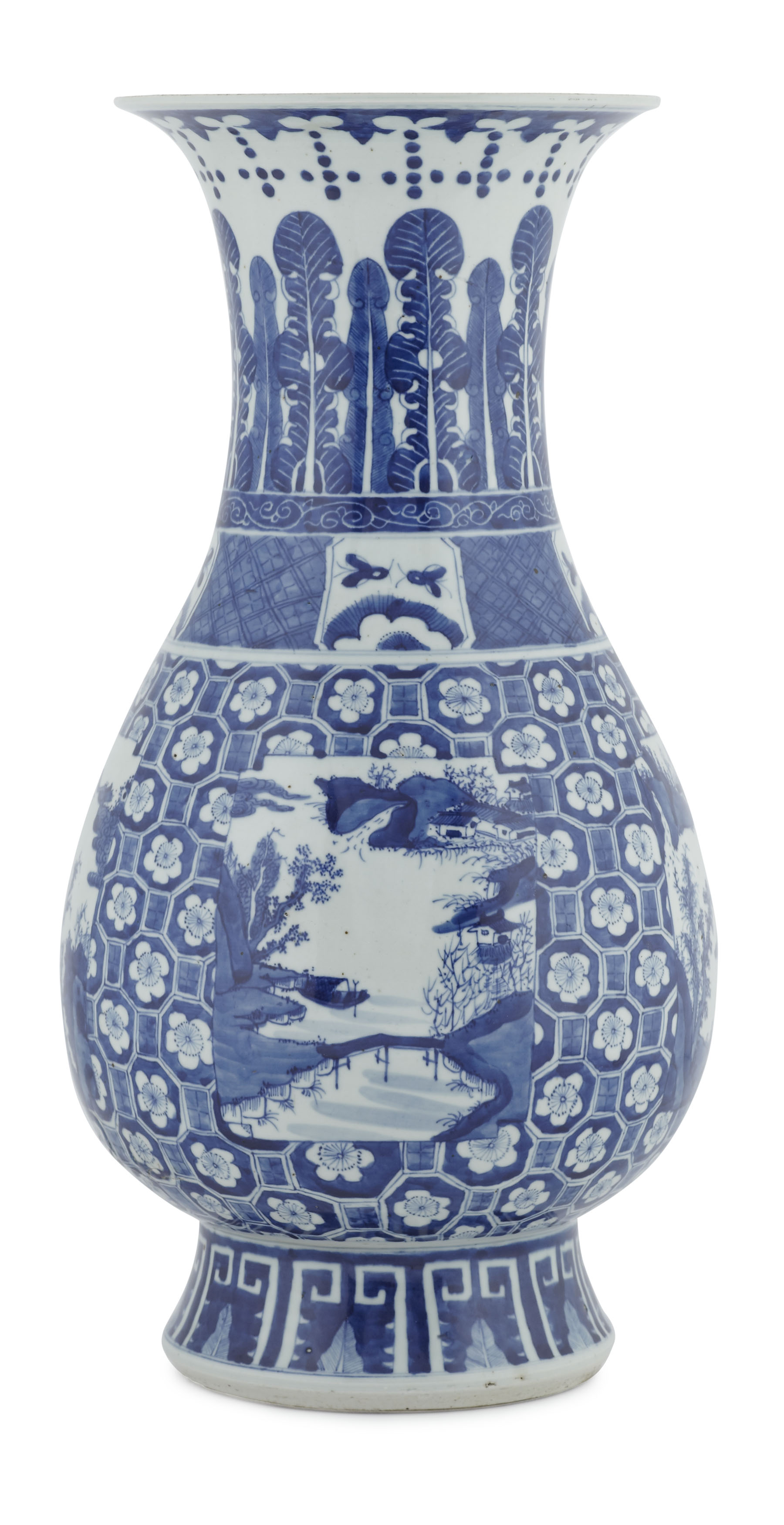 the baluster sides painted with landcsape views against a geometric ground, the flared neck decorated with a band of stiff leaves