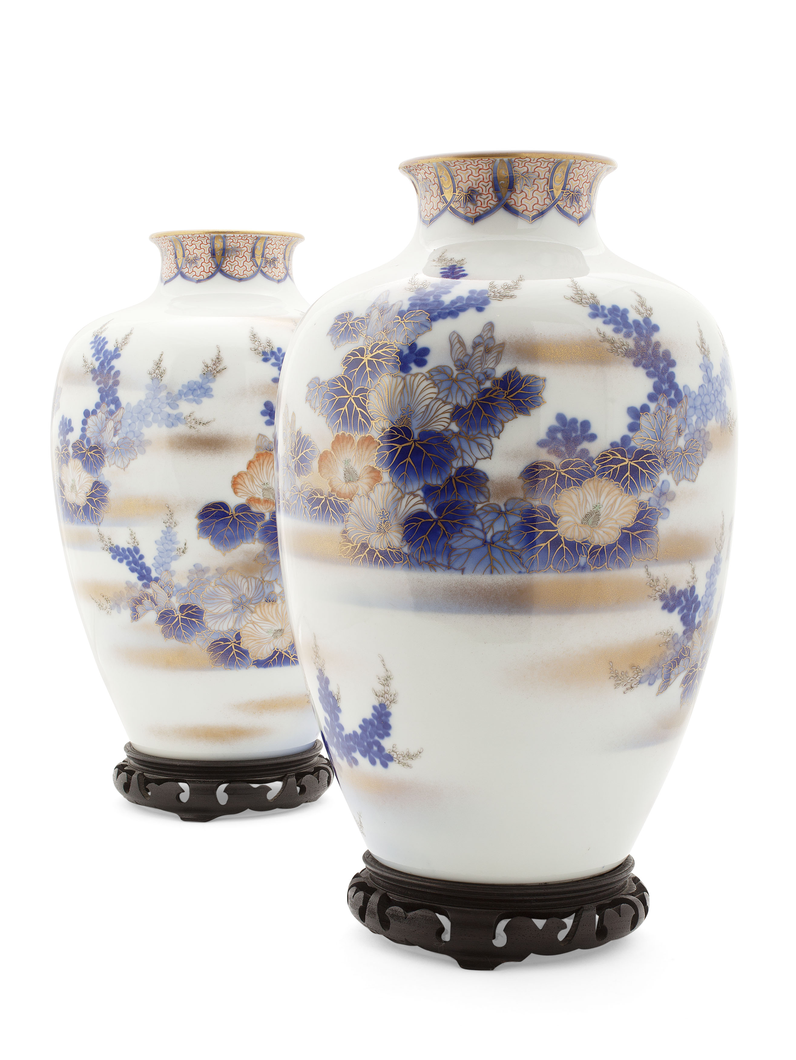 of ovoid form with a narrow neck and flared mouth, decorated in underglaze blue and iron red with hibiscus with white enamel and gilt details, blue mark, on hardwood stands (2)