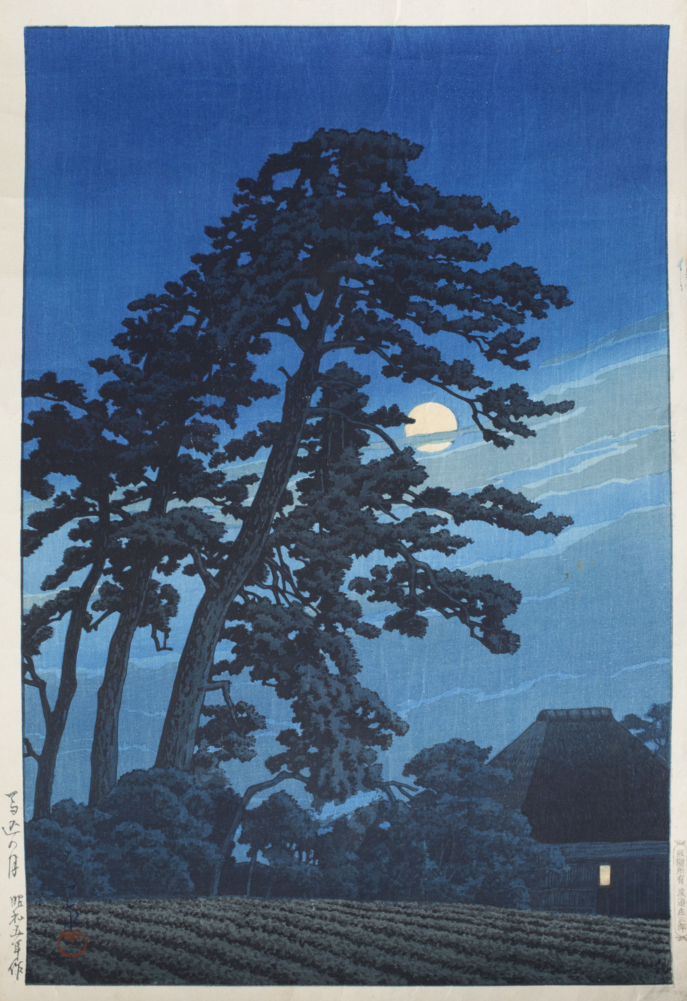MOON AT URAGOME, from the series 'Twenty Views of Tokyo', 1930, with artist signature and seal, published by Watanabe, 36.3cm x 24cm, unframed; SARUSAWA POND, from the series 'Kansai District', 1933, signed in pencil, 37.5 x 24.5cm, unframed (2)