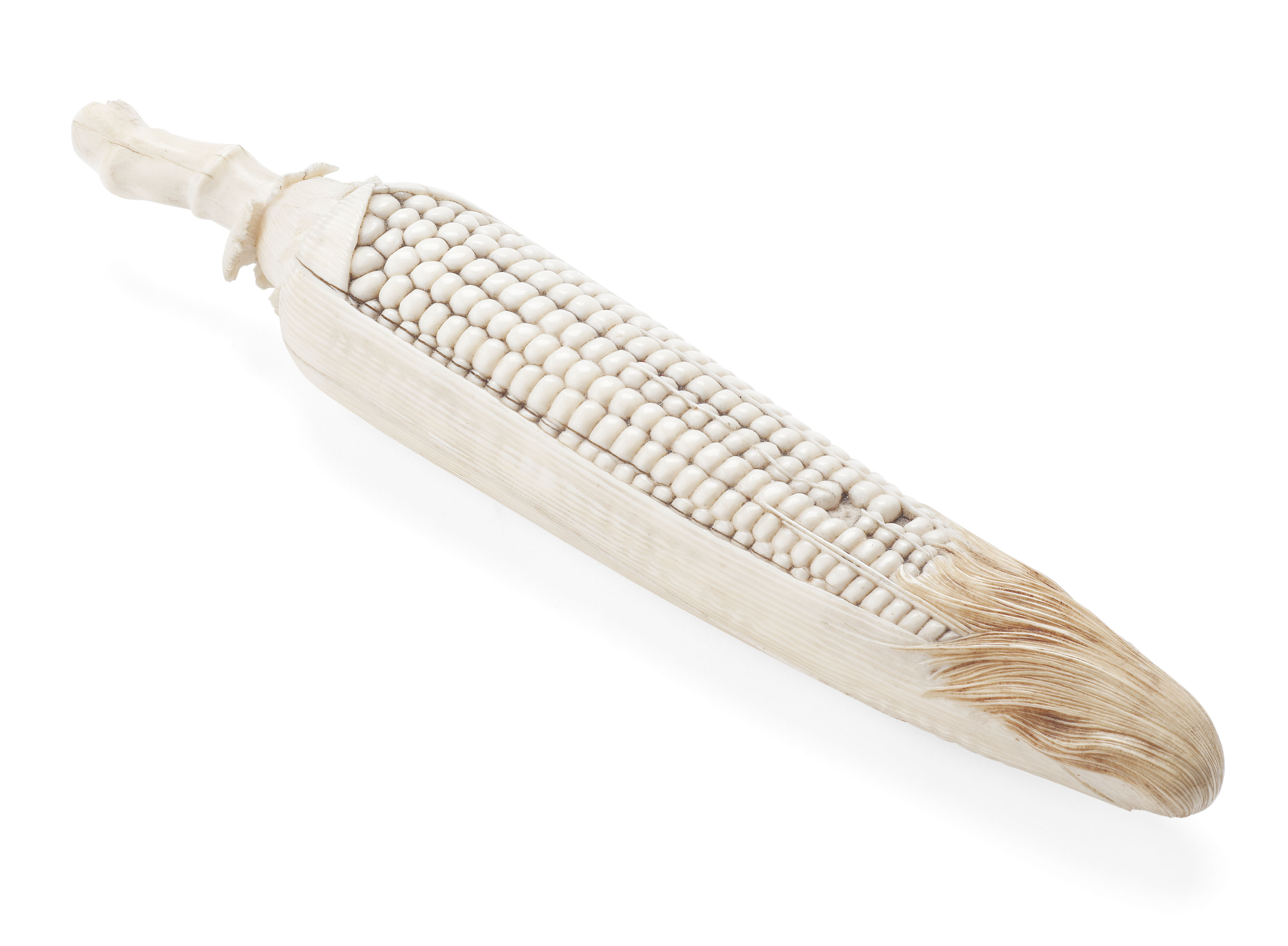 realistically carved as a partially husked ear of corn