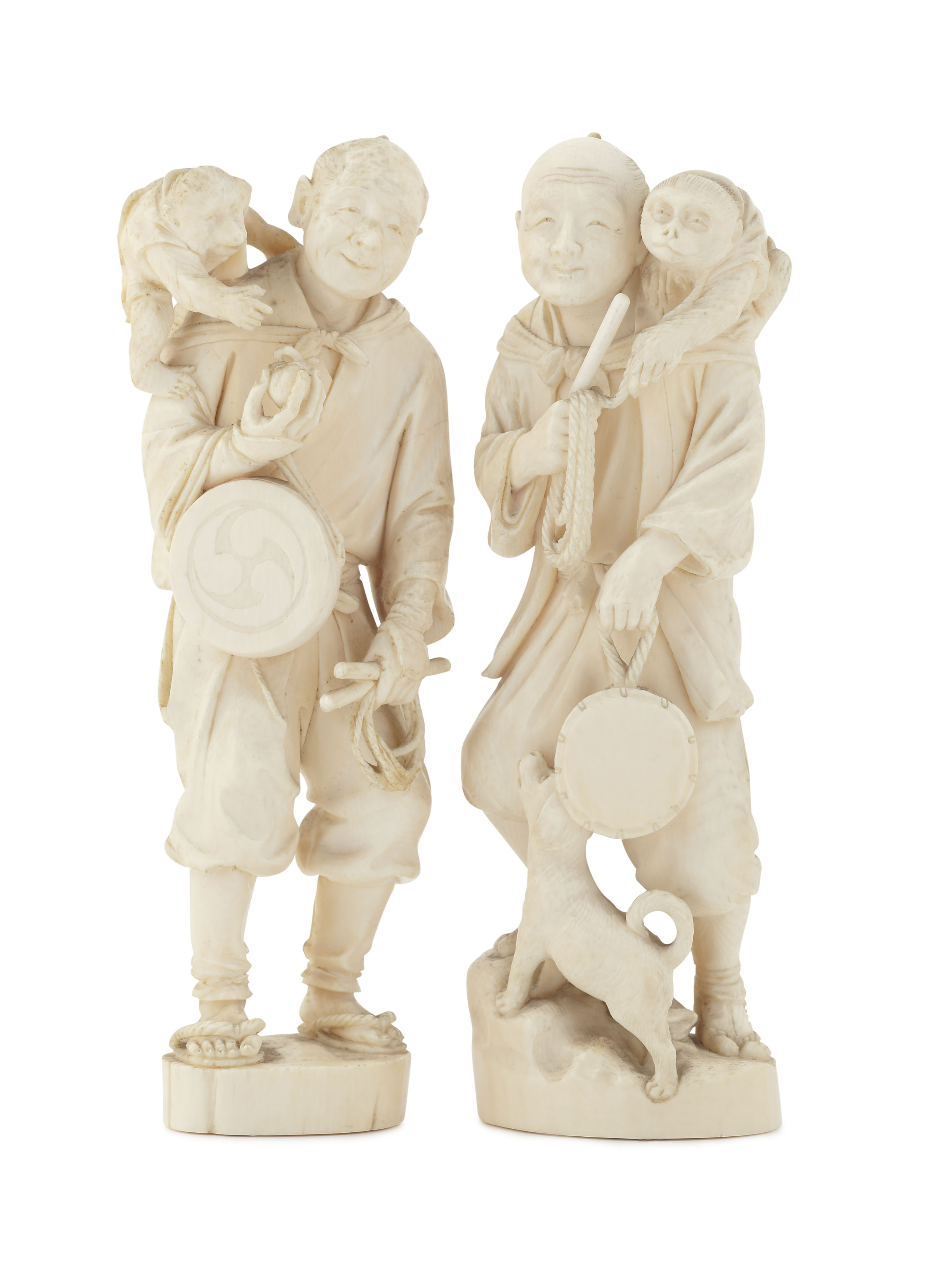 each modelled as a sarumawashi (monkey trainer), the first example with a monkey perched on his shoulder, carrying a gong, a leash and fruit, two character signature mark to base; the second similarly modelled with a dog at his feet (2)