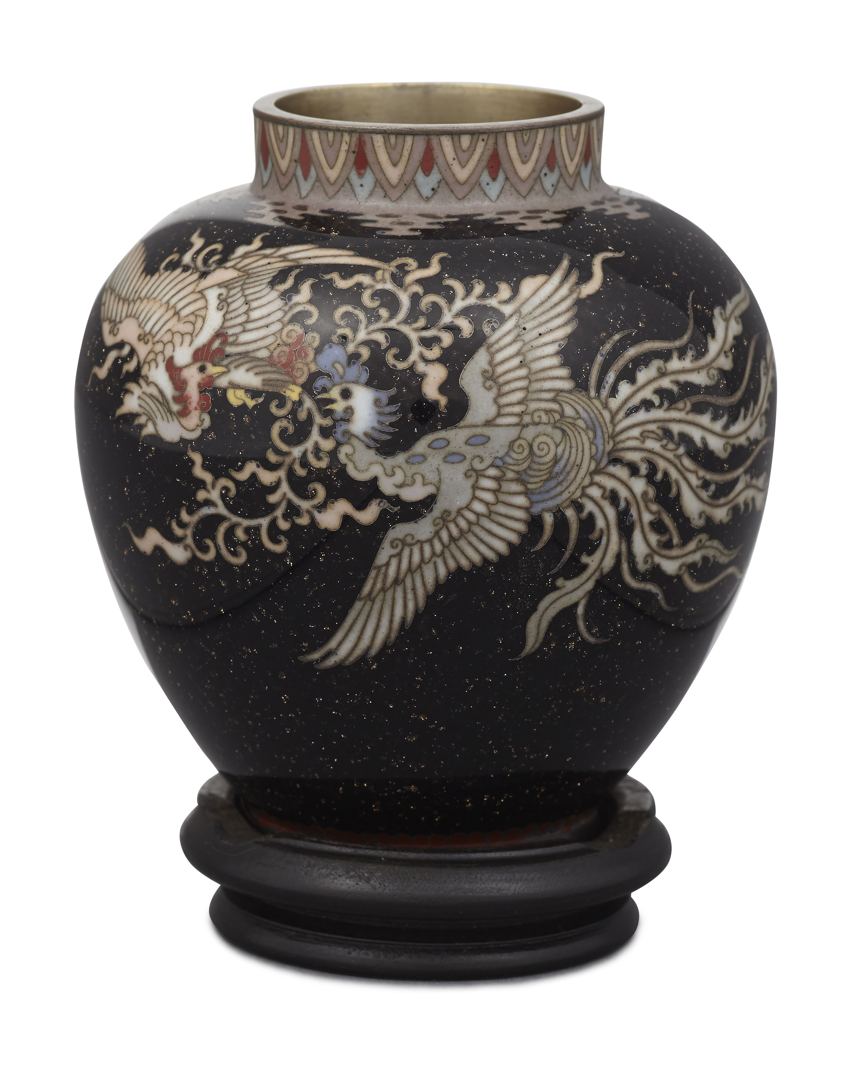 of tapered globular form decorated with flying phoenix against a black gold speckled ground