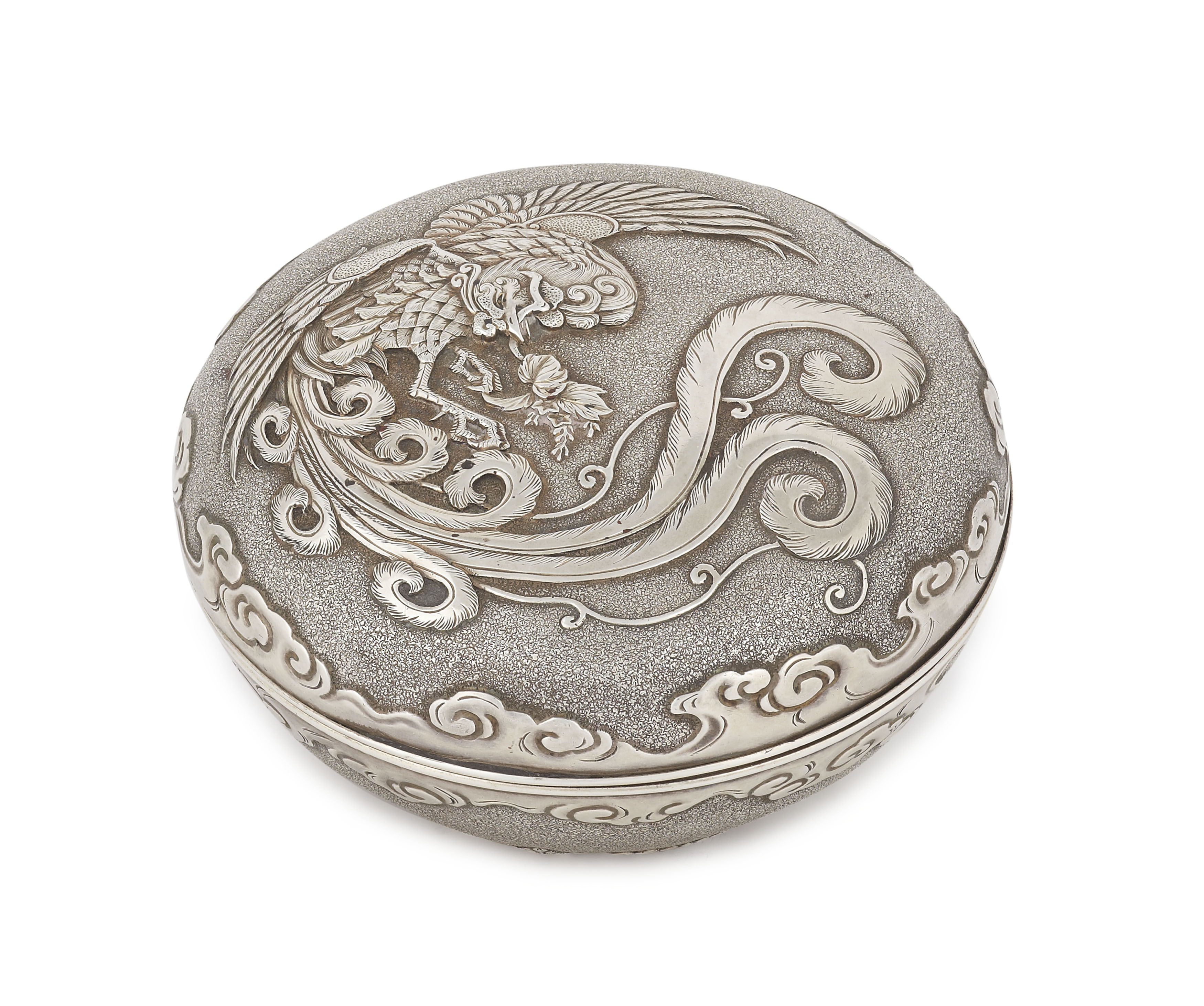 of compressed form with pull off cover, the textured ground with a bird of paradise and scroll borders, the base with foliate formed feet, with twin character marks applied to the base