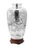 of tapered shoulder form engraved and chased with peonies, prunus and dogwood, with engraved signature, two character mark to base, in a wooden case with stand