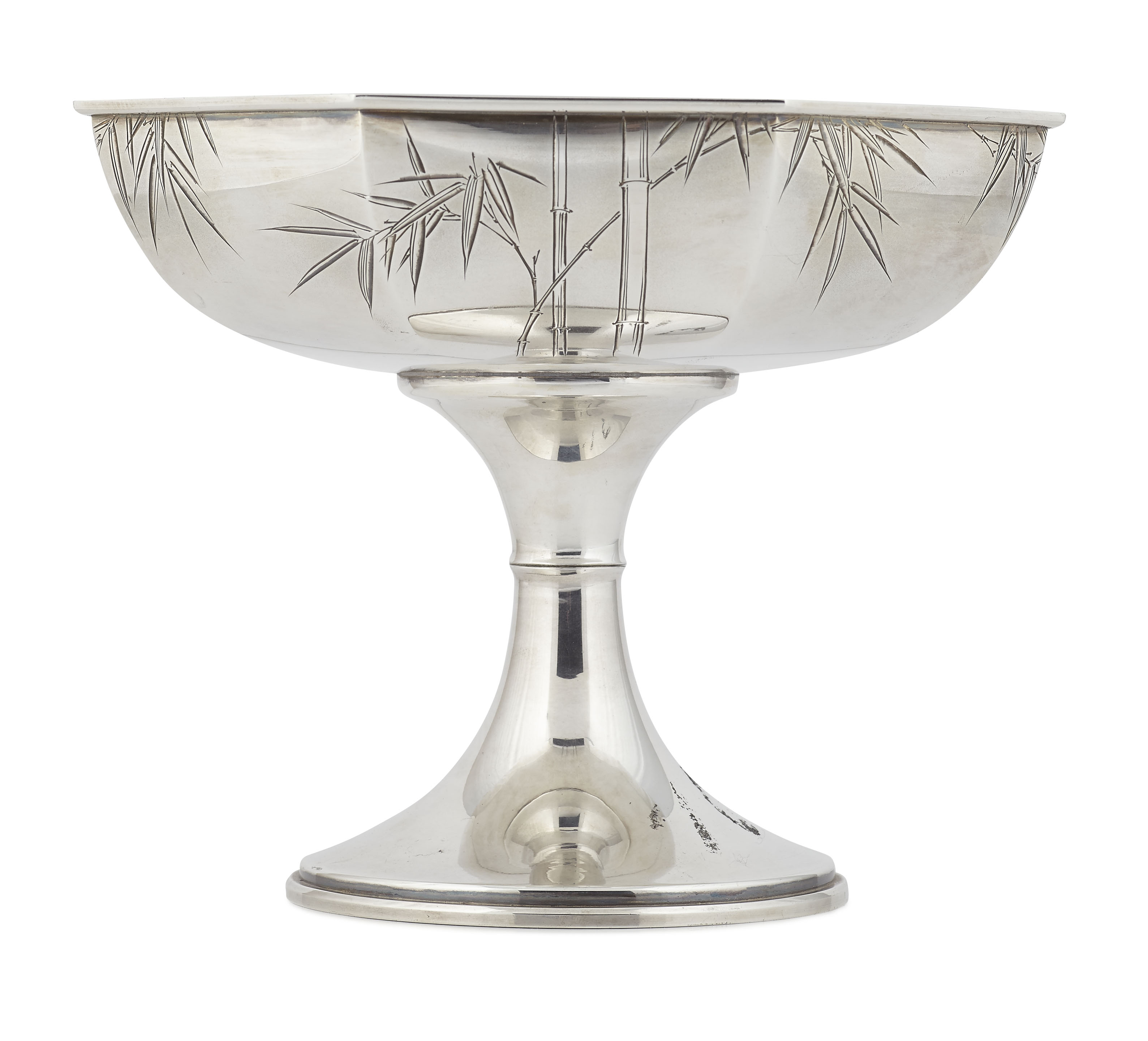 marked K.UYEDA, STERLING, the shallow bowl of octagonal form with engraved bamboo decoration and signature, raised on a slender trumpet stem and spreading foot
