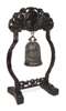 the slightly spreading cylindrical sides cast in low relief with vacant rectangular panels and stylised motifs, the crown formed a double headed mythical beast, 29cm high; togther with an associated carved hardwood stand (2)