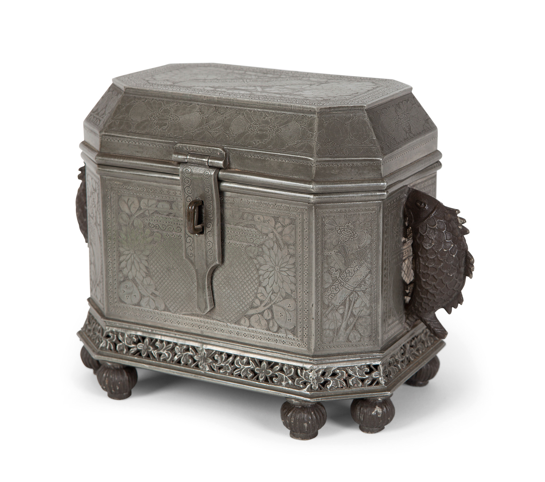 of canted rectangular form with fish form handles and a pierced moulded apron, raised on chrysanthemum feet, engraved allover with floral motifs and auspicious objects