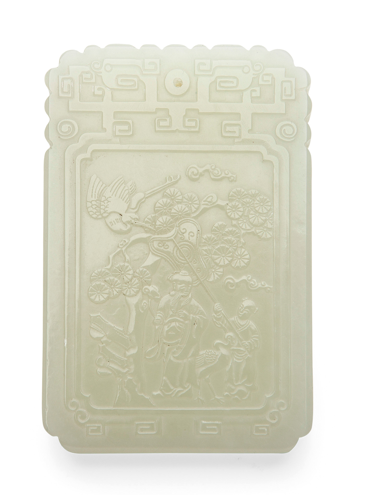 finely carved on one side with a cartouche depicting Shoulao and an attendant beneath a pine tree, surrounded by stylised key-fret and chilong borders, the reverse with inscription in cursive script