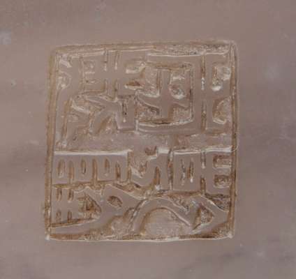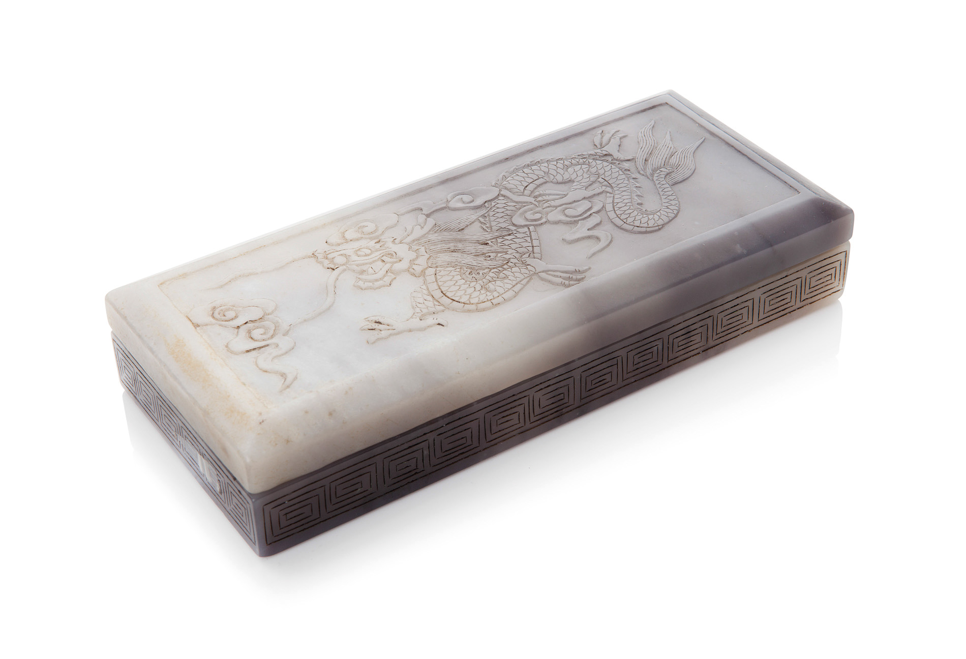 the cover carved in low relief with a writhing dragon among clouds, the sides with Greek key design; together with A HARDSTONE SEAL, carved with a lion and four-character mark on base (2)