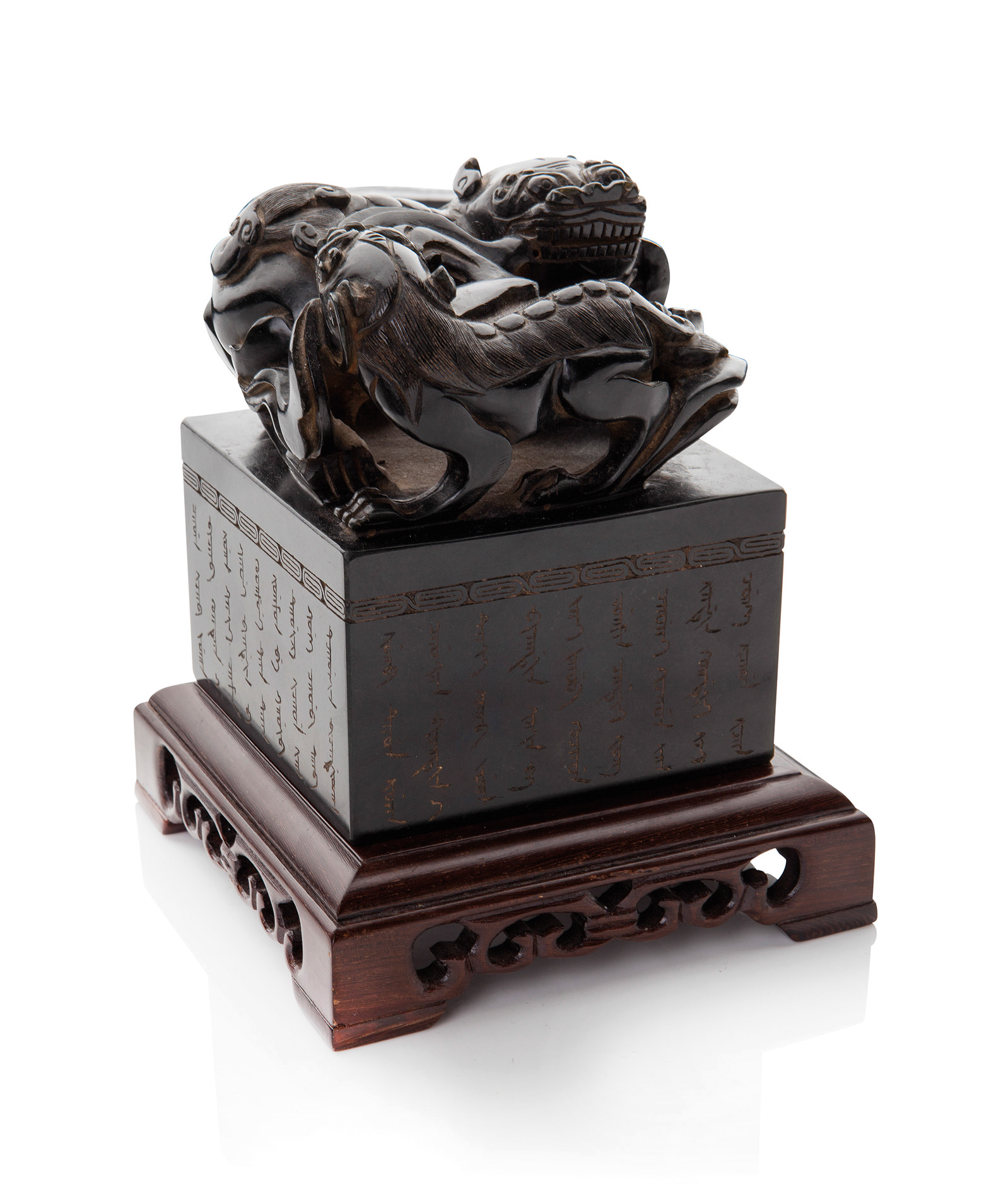 the sides engraved with calligraphic script in gilt, surmounted by two lions, on a carved wood stand