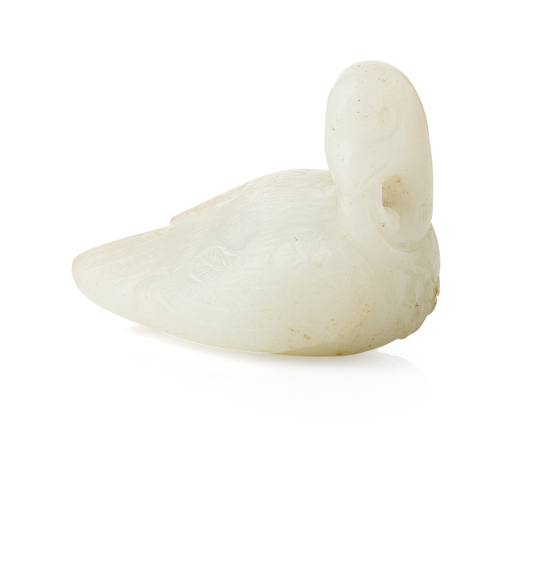 Song style, carved with its head turned to the side with a flowering branch in its beak, the feathers well incised, the white stone with russet markings