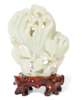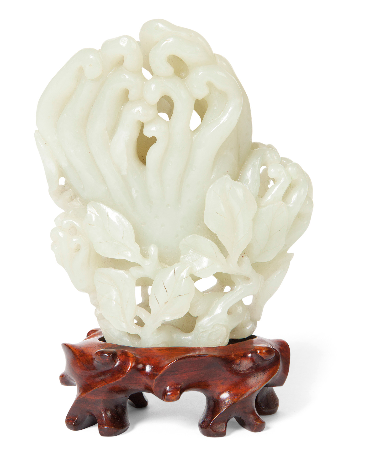 realistically carved as three finger citrons with leaves on a carved rootwood stand