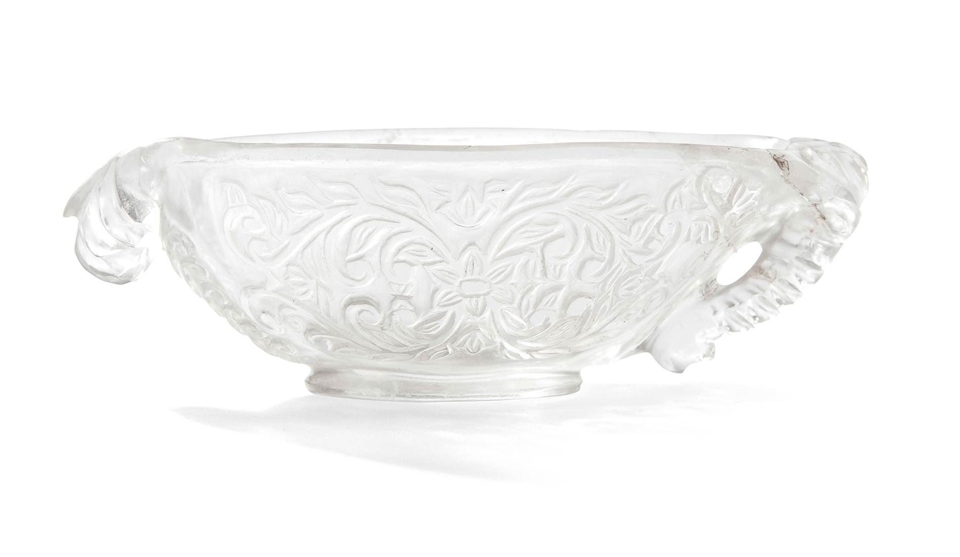 of open oval form with a carved handle to one end, decorated in the Mughal style with scrolling foliage in low relief